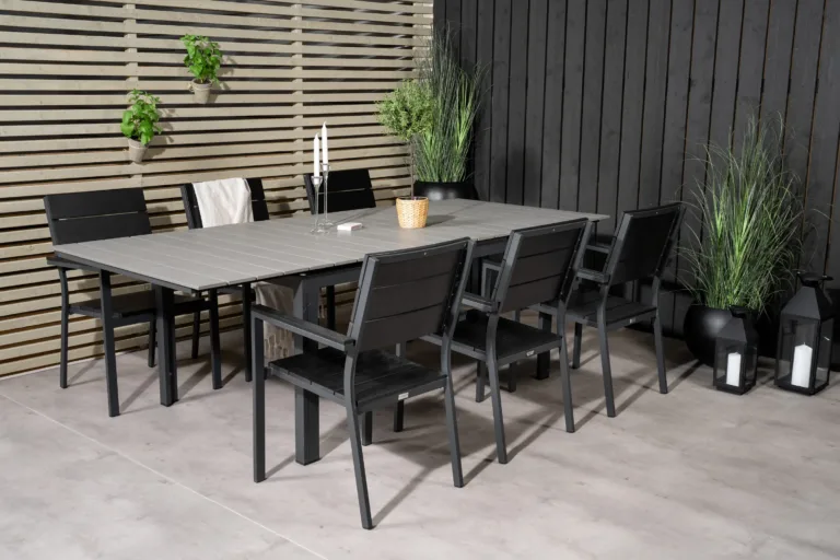 Minimalistlik põhjamaine disain, sirged jooned ning tagasihoidlikud mustad ja hallid toonid teevad sellest aiadiningukomplektist sobiva valiku igasse väliruumi.