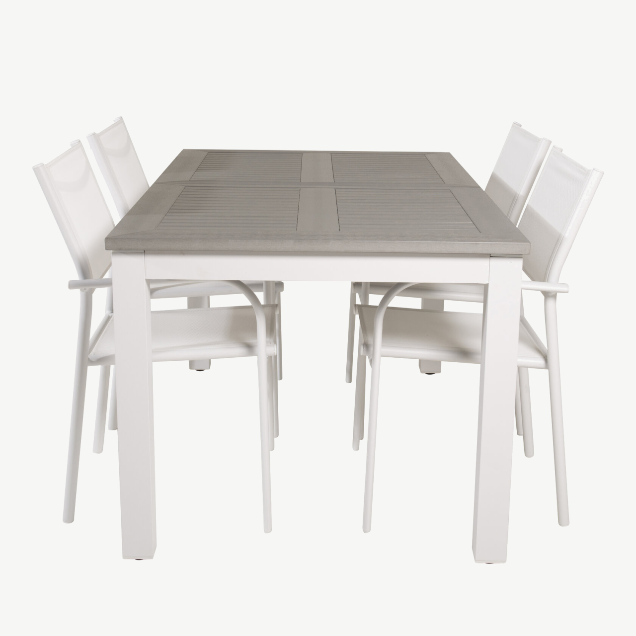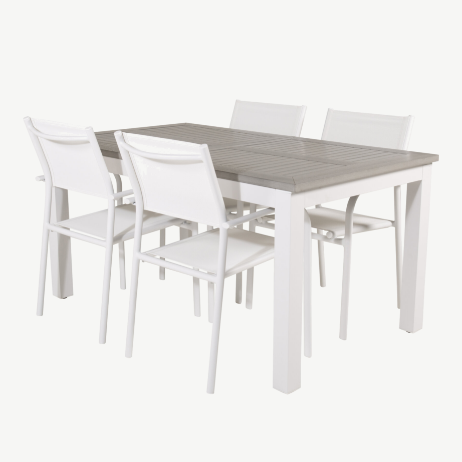 Hall aiasöögilaud toolidega on neutraalses toonis, sobitudes erinevate aiakujundustega. Valge raam lisab põhjamaist selgust ja lihtsust. Toolid on ergonoomilised ja kõrge istumismugavusega – võimalik veeta pikki ja mõnusaid hetki koos pere või sõpradega. Tänu kergele alumiiniumraamile ning textilene’ist pindadele on toolid hõlpsasti liigutatavad ja väga praktilised igapäevases kasutuses.