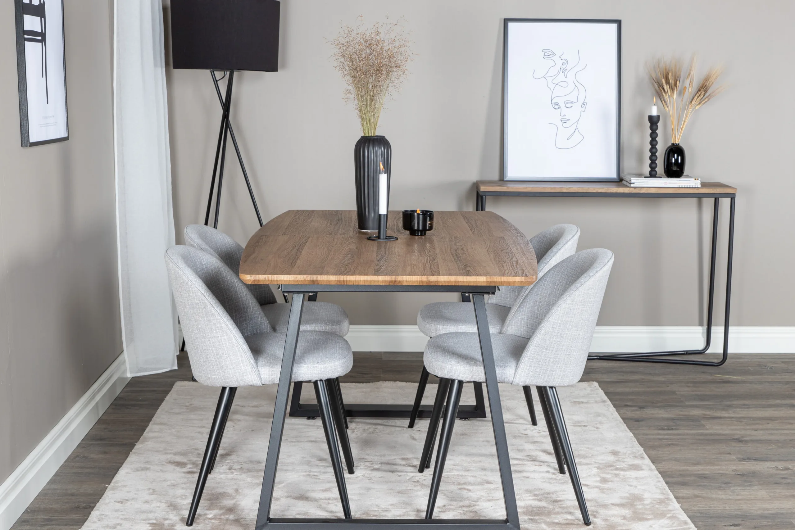 Pähklitooni söögilaua komplekt Inca ühendab tänapäevase disaini ja praktilised lahendused igapäevaseks kasutuseks või pidulikemaks sündmusteks. Elegantne puidumustriga pikendatav laud ning mustad metalljalad loovad põhjamaise minimalistliku mulje. Selle söögilaua komplekti juurde kuuluvad mugavad, helehalli velvetkangaga polsterdatud toolid mustadel metalljalgadel – ideaalne neile, kes hindavad esteetikat ja kasutusmugavust.