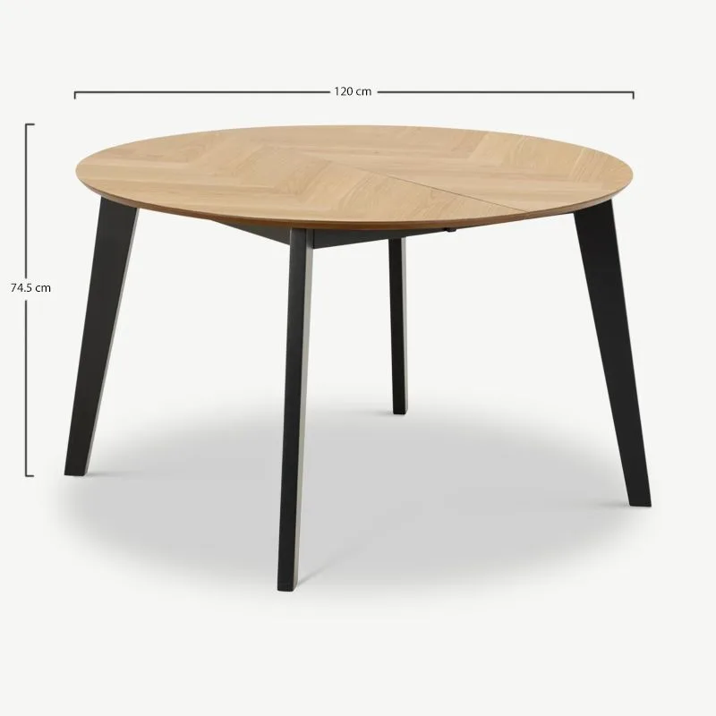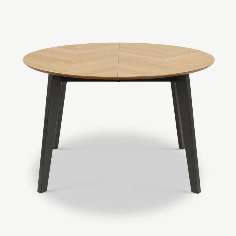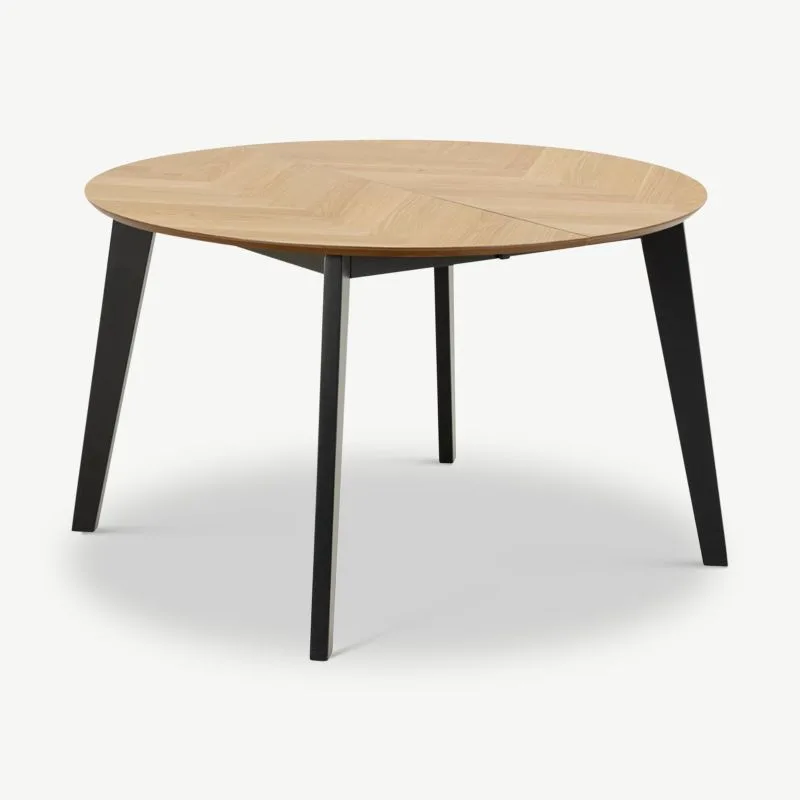 Uuesti avastatud kalasabamustriga võib see söögilaud tuua teie söögiruumi uue elu. Ümar kuju laiendab kujundust optiliselt. Kui sellest ei piisa, võite alati kasutada kahte kaasasolevat pikendusplaati. Aga kuidas on lood mustade puidust jalgadega? Need täiendavad tänapäevast Põhjamaade esteetikat. See ümmargune söögilaud loob kindlasti sooja atmosfääri teie söögitoas. Mida te veel ootate?