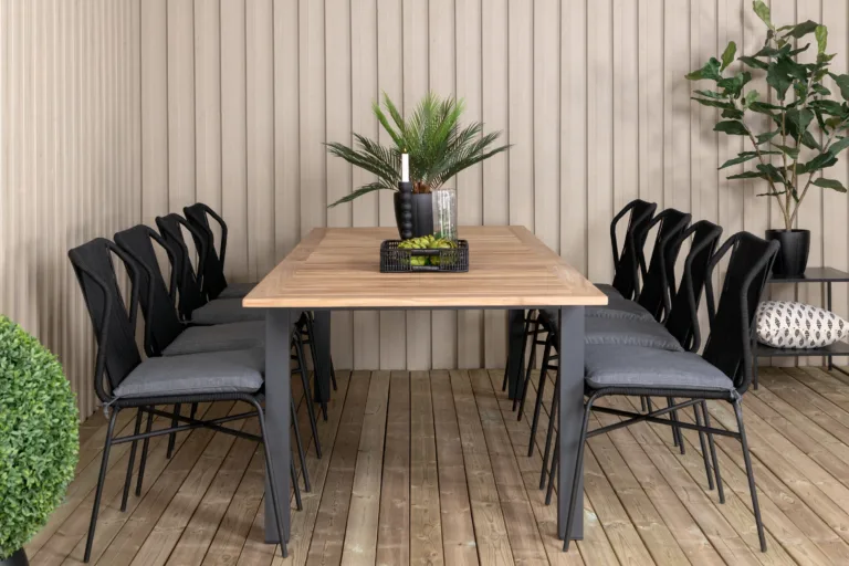 Panama söögikomplekt ühendab põhjamaise disaini ja vastupidavad materjalid, pakkudes ideaalset lahendust avarale terrassile või aeda. Komplekti kuulub suur pikendatav tiigipuust söögilaud ning kaheksa musta köiega tooli, mis loovad harmoonilise terviku nii igapäevasteks õhtusöökideks kui ka suvisteks aiapidudeks.