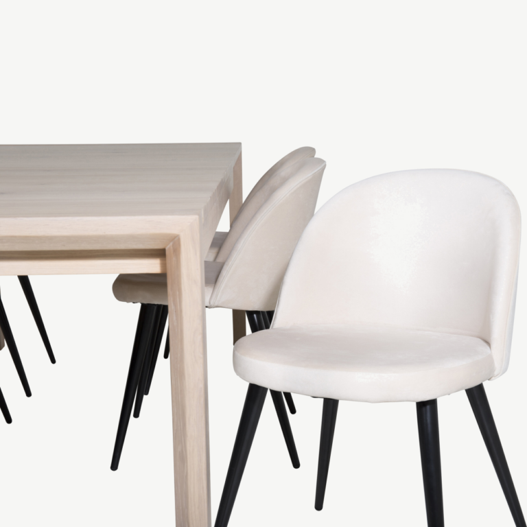 - Mugavad sametpolstriga toolid – Velvet toolide raam on painutatud puidust ning iste ja seljatugi mõnusalt pehmendatud. Sametiselt sile, vastupidav 100% polüester kangas loob hubase tunde, mustad metalljalad lisavad modernset stiili. Beež polster täiendab valgusküllast interjööri ning toolid on kergesti hooldatavad.