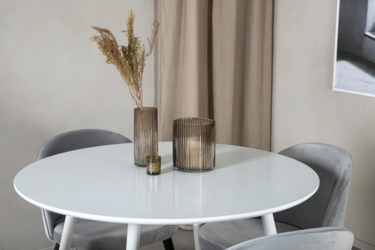 - Modernne ja neutraalne värvilahendus – valge ja helehall kombinatsioon muudab selle söögigrupi lihtsalt sobitatavaks erinevate sisekujundustega.
