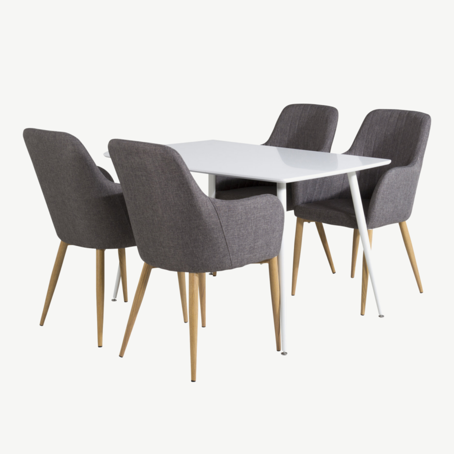 Polar valge söögilaua komplekt tumehallide toolidega ühendab ajatult minimalistliku disaini ning põhjamaiselt karge elegantsi. See komplekt sobib hästi igasse kaasaegsesse kööki või söögituppa, pakkudes ideaalse paiga söömiseks ja meeleolukateks õhtusöökideks. Komplektis on ruumikas ristkülikukujuline laud vastupidavast valgest MDF-ist ning neli Comfort sarja tooli, millel on tumehall polster ja naturaalse tamme tooni terasjalad.