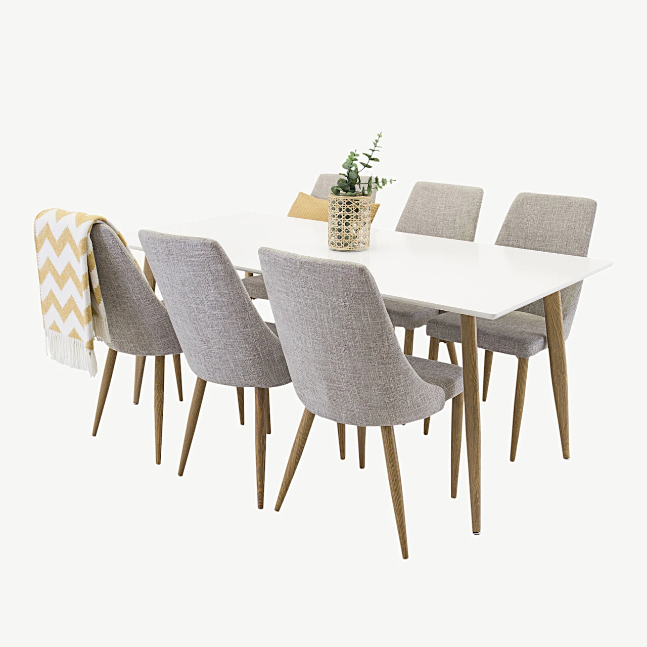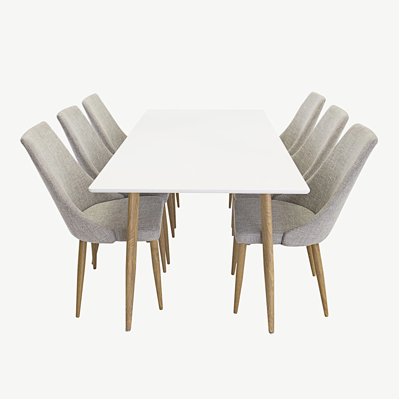 Valge ja helehalli toonid koos soojade puiduvärvidega loovad avara ja modernse mulje, mis sobitub suurepäraselt nii väiksematesse kui ka suurematesse söögitubadesse. Lihtne ning puhas joon tagab komplekti sobivuse erinevate sisustusstiilidega.
