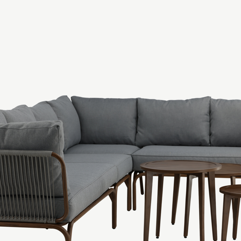 Diivanikomplekt koosneb viiekohalisest nurgadiivanist ja praktilisest lauasüsteemist. Kolmest osast koosnev lauakomplekt on valmistatud pruuniks lakitud puidust, mis lisab looduslähedast ilmet ja sobib suurepäraselt nii klassikalisse kui ka modernsesse õuekeskkonda.