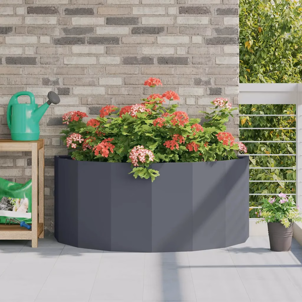 See poolringikujuline terasest taimekast aitab luua selge piiri istutusalale seina või piirde ees, sobides hästi aeda, terrassile või rõdule. Antratsiitne viimistlus täiendab kaasaegset välisruumi ning vastupidav konstruktsioon hoiab taimi kindlalt paigal eri aastaaegadel.