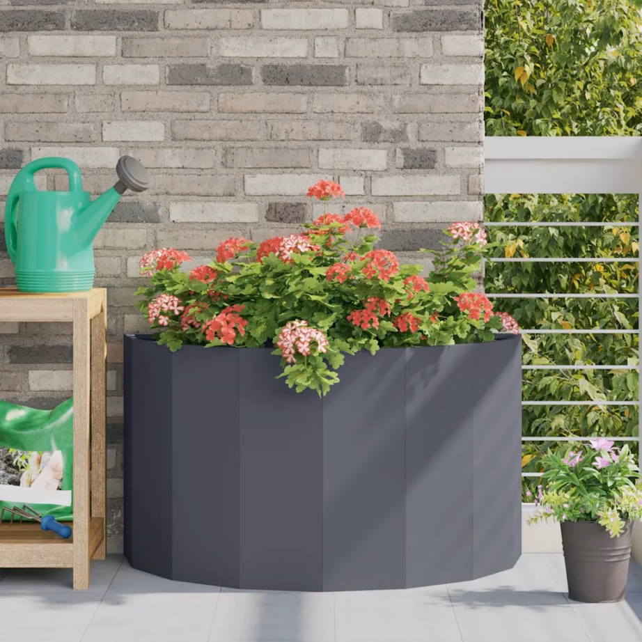 See poolringikujuline terasest taimekast sobib hästi seinte ja piirdeaedade äärde, tuues välialale korrastatud istutusala ja kaasaegse ilme. Tugev terasest konstruktsioon ja antratsiitne viimistlus aitavad taimedel esile tõusta ning taluvad igapäevast välitingimustes kasutust.
