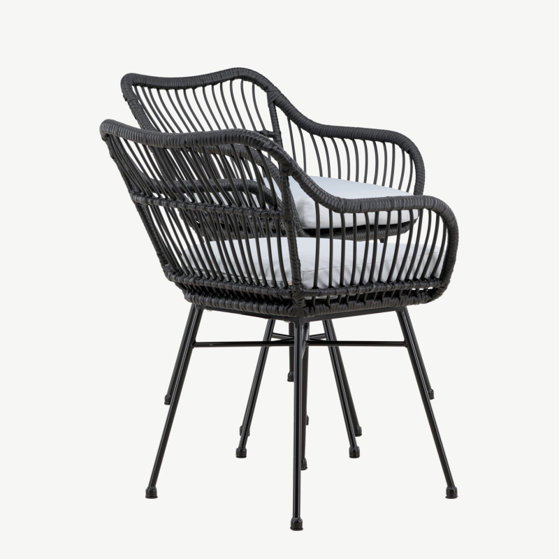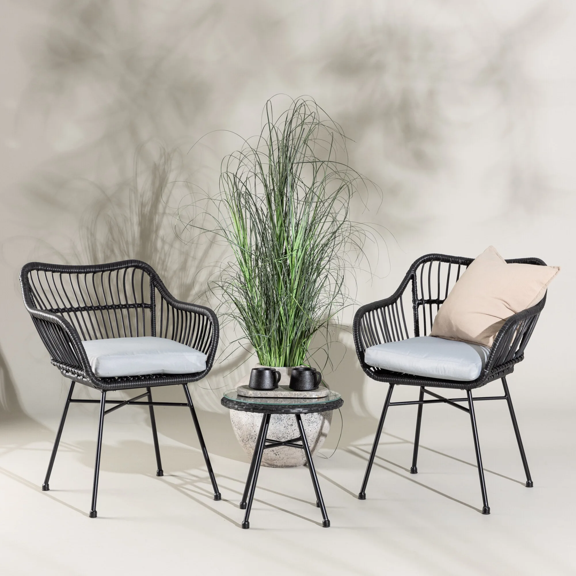 Komplekti kuuluvad ka pehmed valged istmepadjad, mis tagavad maksimaalse mugavuse. Lisaks kuulub komplekti ka kohvilaud, mille detailid on samuti valmistatud mustast punutisest ning millele lisab elegantsi klaasist lauaplaat. See kombinatsioon loob õhulise ja kaasaegse ilme, mis sobib suurepäraselt igasse väliruumidesse.