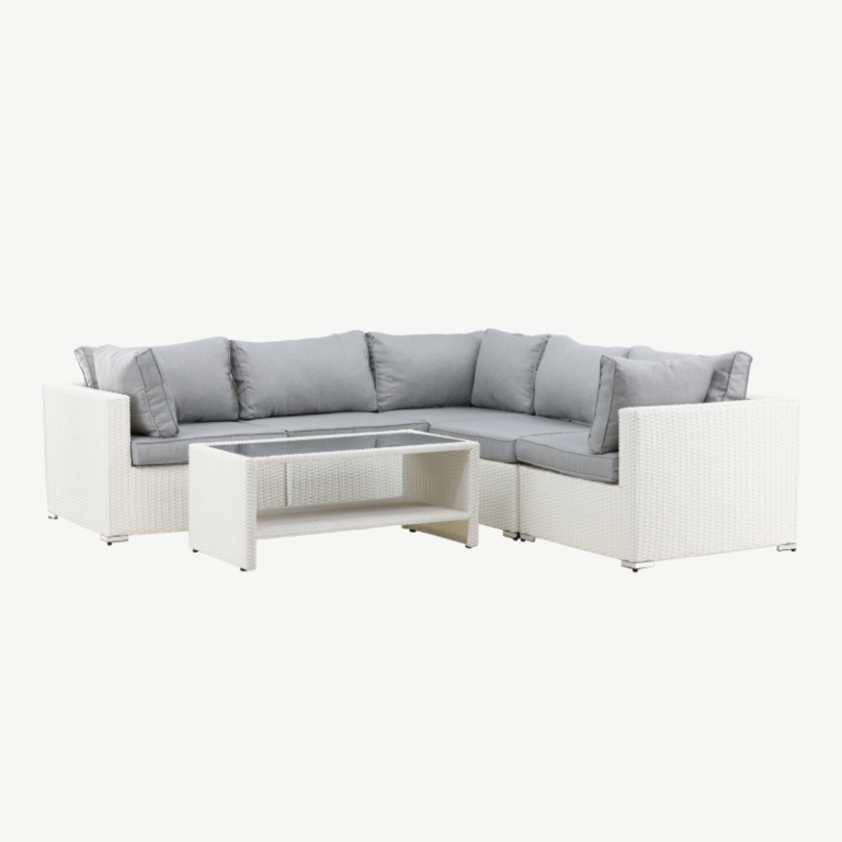 Diivani vastupidav raam on valmistatud tugevast metallist, mis tagab mööbli stabiilsuse ja pikaealisuse. Pealispinna moodustab valge kunstpunutis, mis on ilmastikukindel ja UV-kaitsega, mistõttu see ei pleeku päikese käes. Pehme ja luksuslik istumismugavus on tagatud tumedashallide patjadega, mis on mõnusalt paksud ning pakuvad suurepärast tuge.