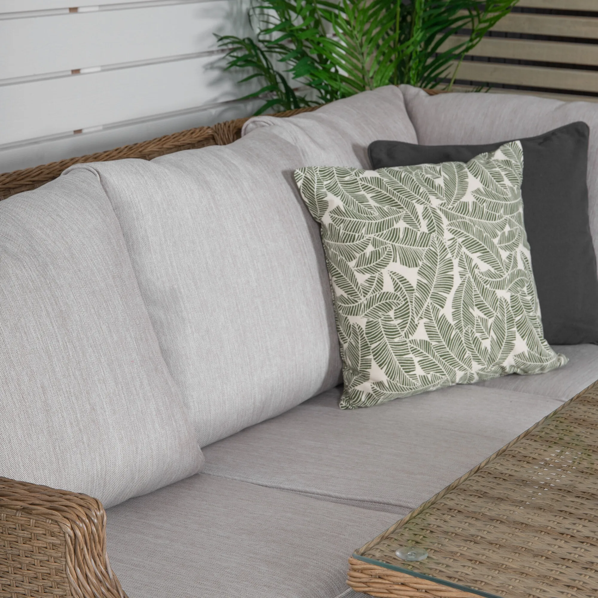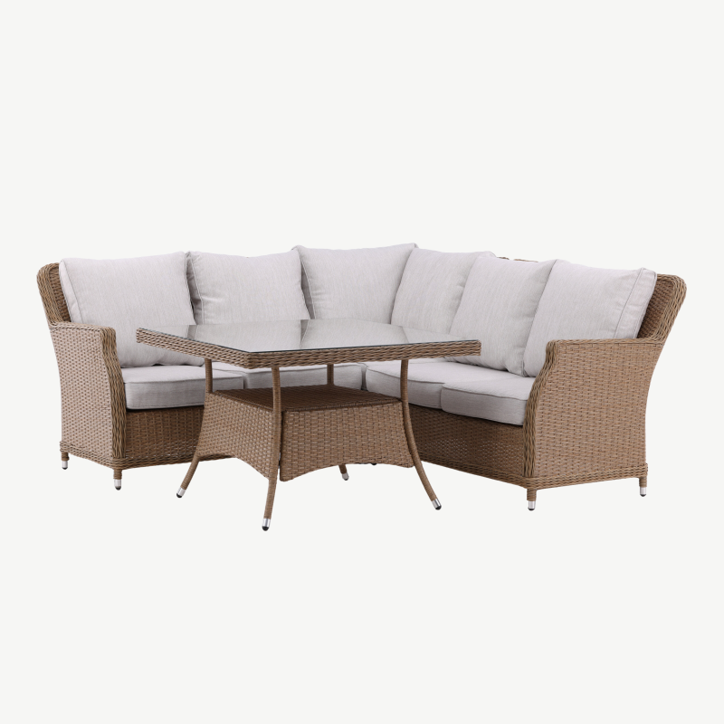 Komplekt koosneb neljakohalisest nurgadiivanist ja praktilisest kõrgemast kohvilauast. Diivanil on tugev metallraam, mis tagab stabiilsuse ja pika eluea. Punuvmaterjal, mida on kasutatud diivani katmiseks, on naturaalset tooni kunstpunutis, mis on vastupidav UV-kiirgusele ega tuhmu aja jooksul. Pehmed liivakarva istme- ja seljatoepadjad lisavad istumismugavust ning loovad elegantse ja kutsuva ilme.