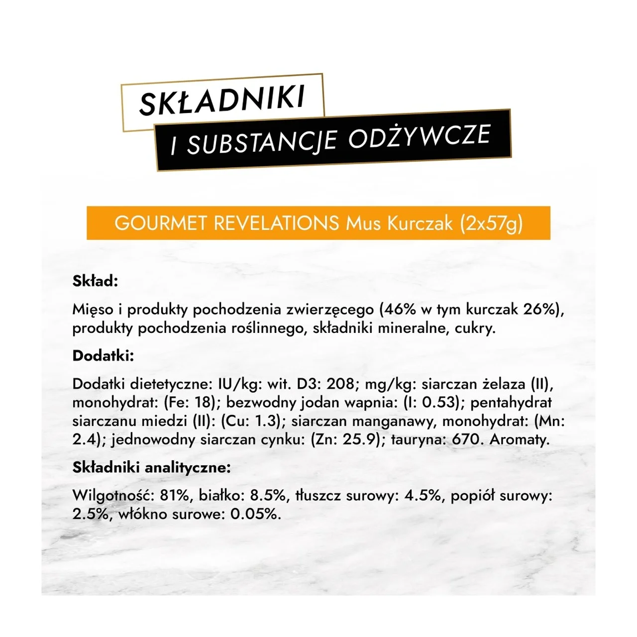 PURINA Gourmet Revelations Mousse with chicken in sauce on täissööt täiskasvanud kassidele, milles on kasutatud kvaliteetseid koostisosi ning millel on ainulaadne serveerimisviis. Toodet iseloomustab õrn ja pehme kanamaitseline mousse, millele on lisatud isuäratav kastmekiht – ideaalne valik kassidele, kes hindavad ainulaadseid maitseelamusi. Mugavad ühe portsjoni pakendid tagavad, et sinu kass saab alati värske toidu ning see sobib kõikidele tõugudele.