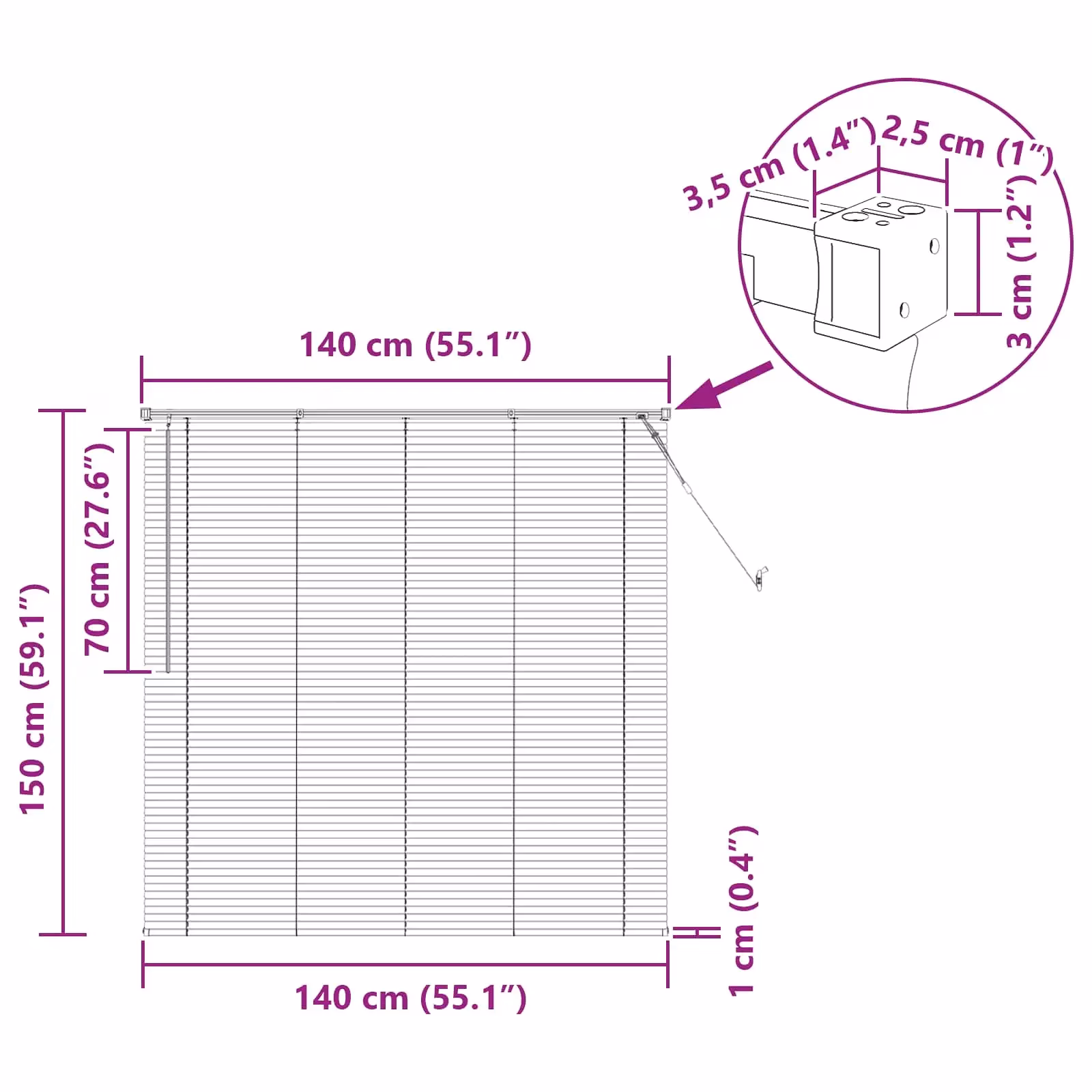 - Praktiline valguse reguleerimine toimub pöörleva varre abil, mis võimaldab lamellide kaldenurka täpselt sättida ja luua soovitud valgus- ning privaatsustaseme.