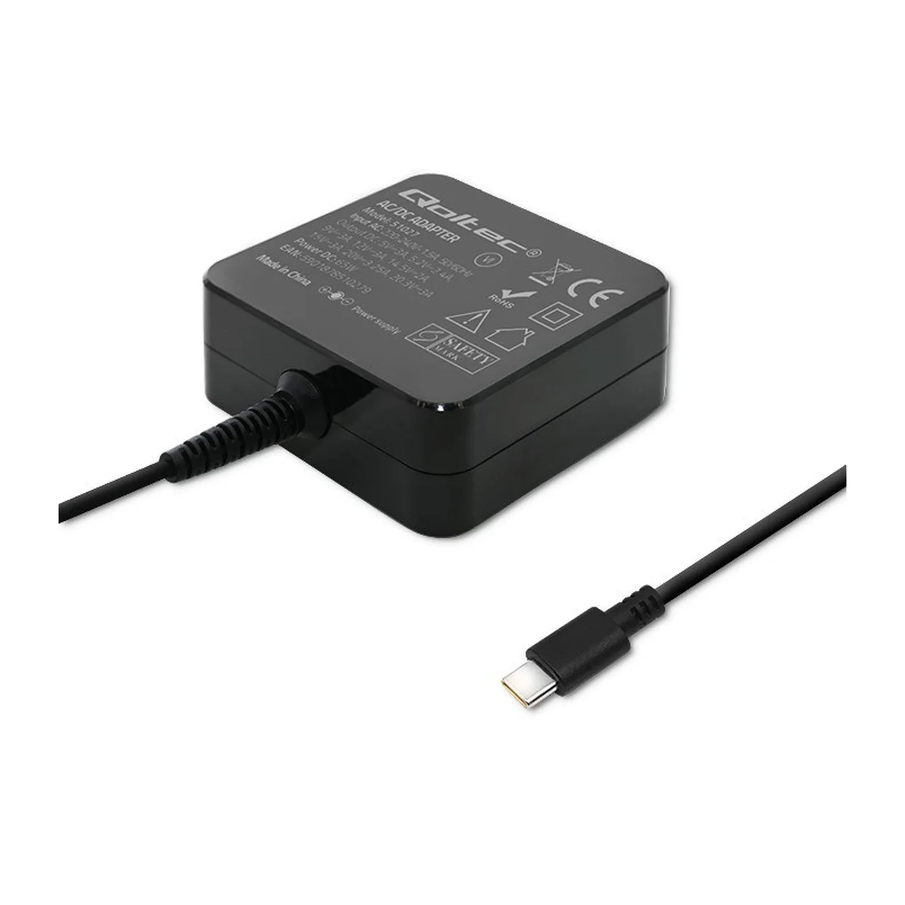 Qoltec 51027 on 65W USB-C PD laadija, mis sobib musta värvi disainiga sülearvutite ja mobiilseadmete kiireks ja turvaliseks laadimiseks.