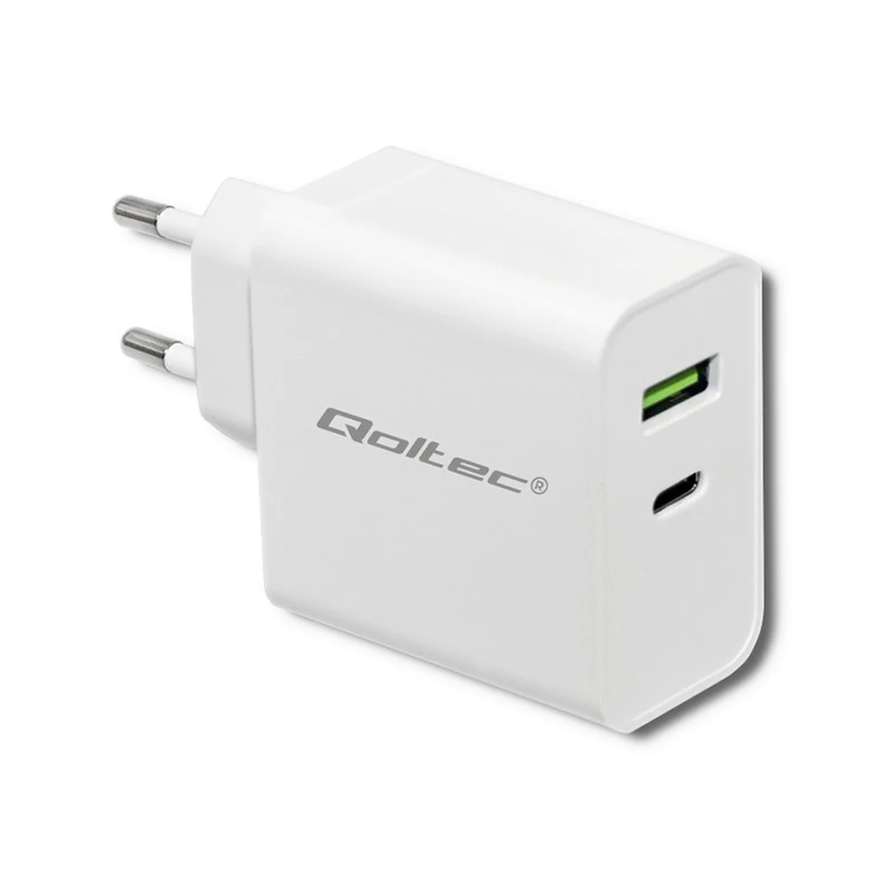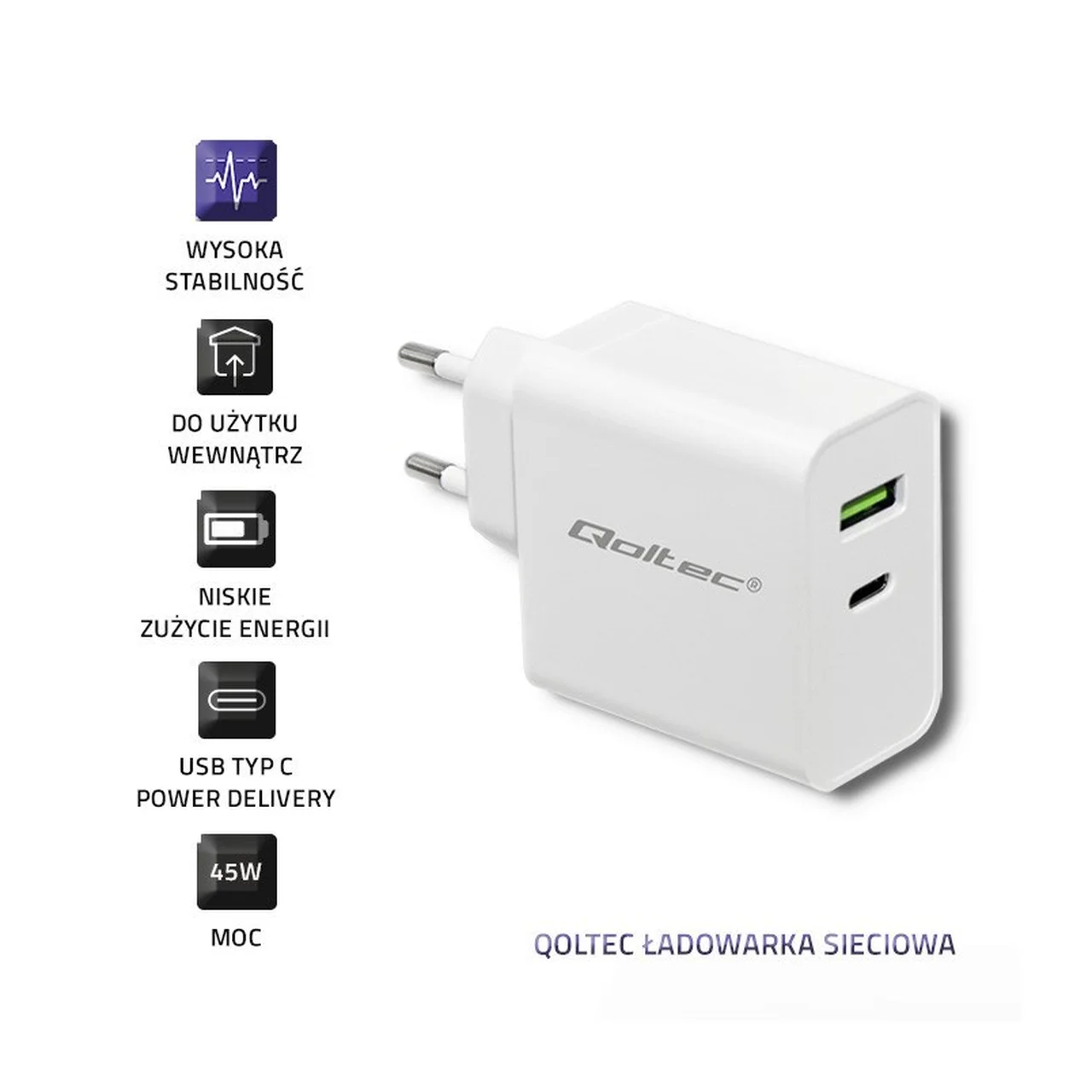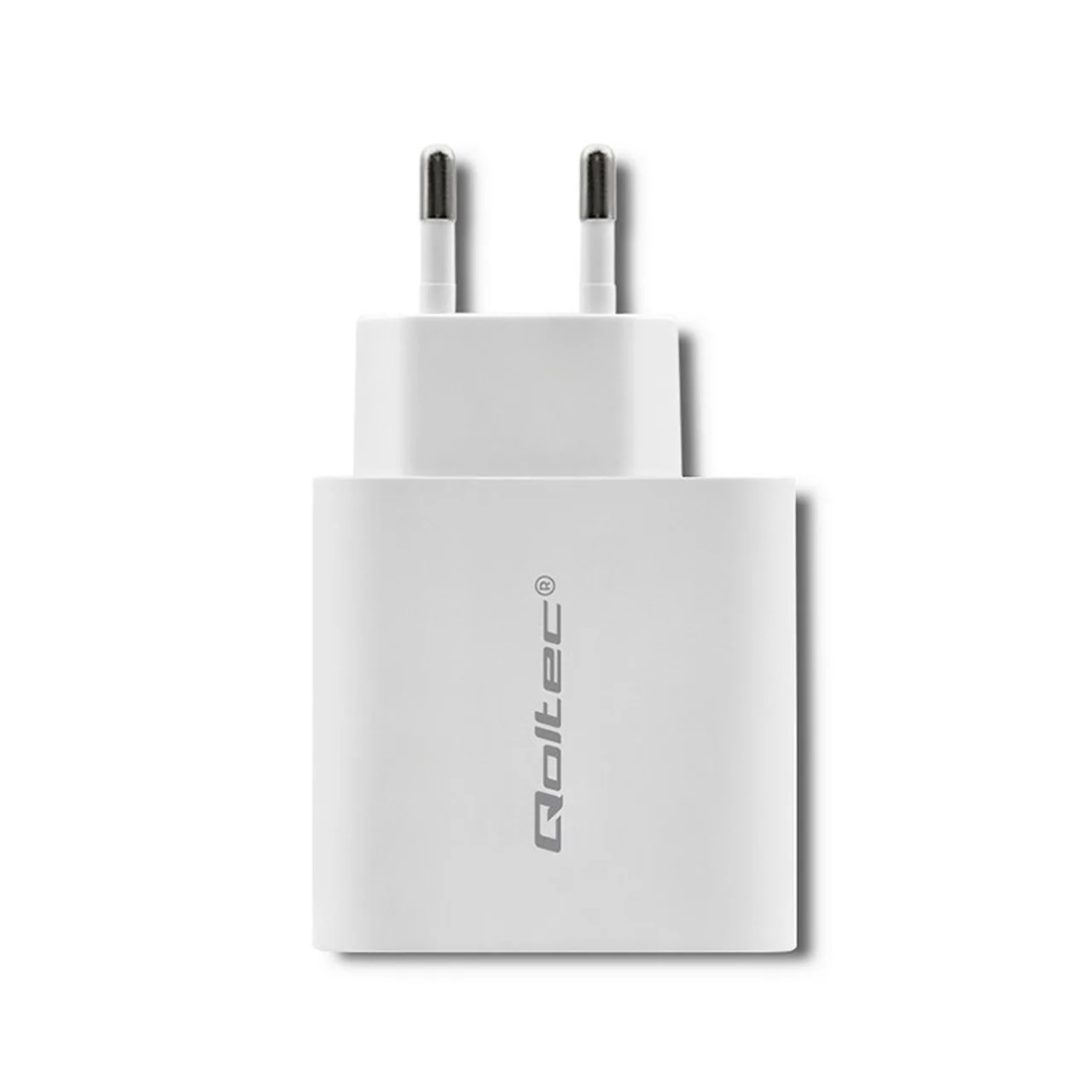 Qoltec 51718 45W valge USB-C PD ja USB seinalaadija 220–240V nutiseadmetele