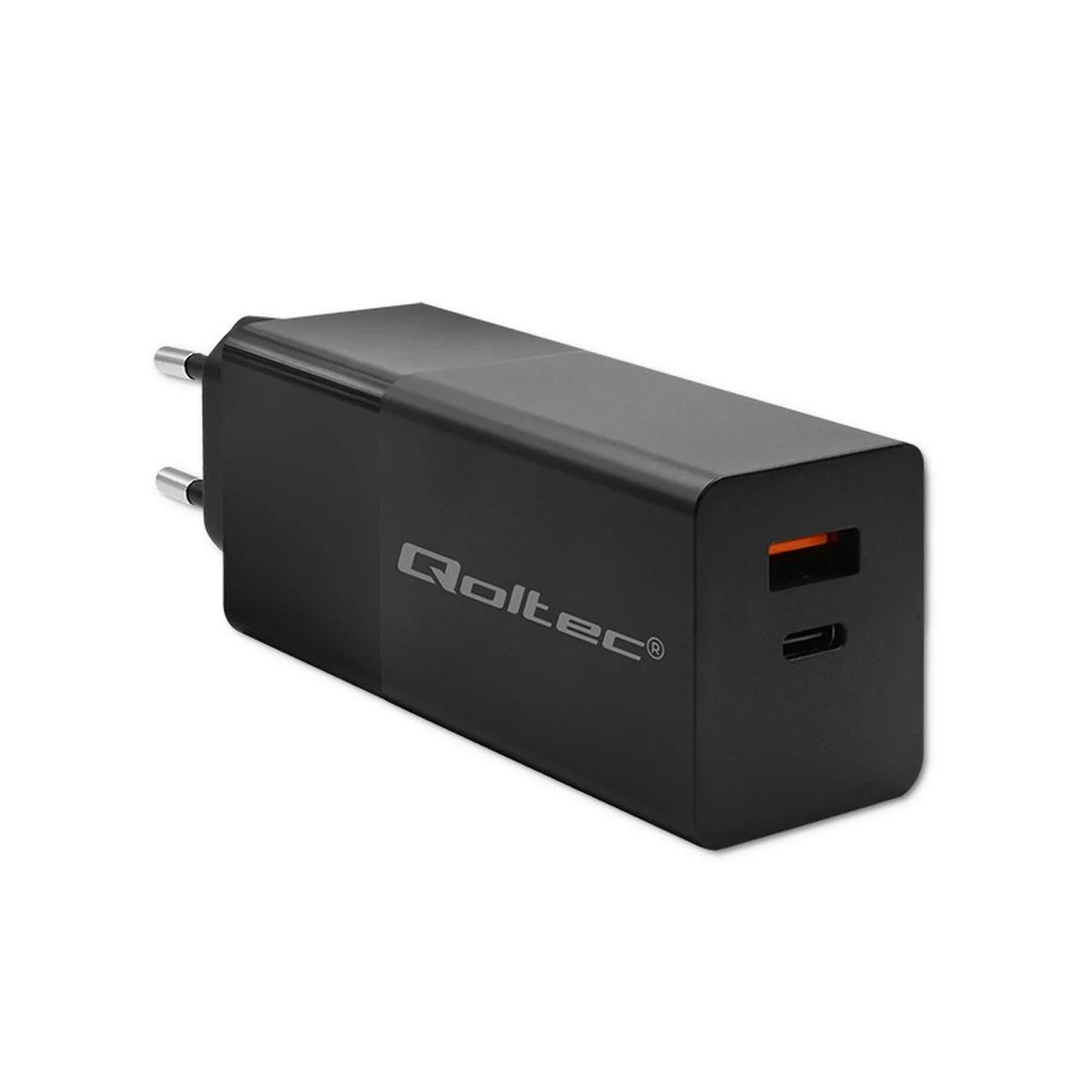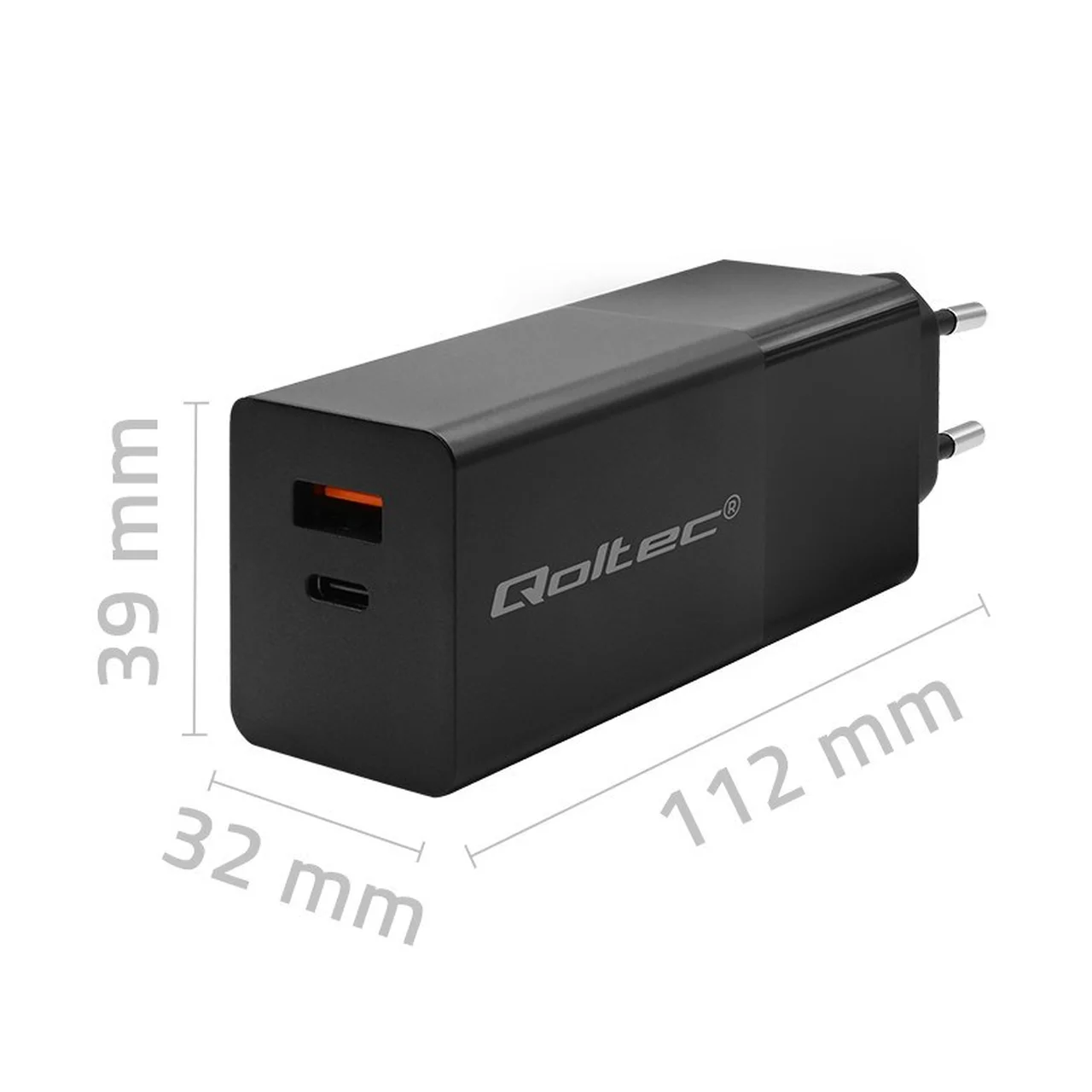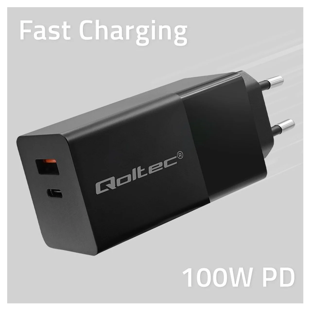 Qoltec 52382 100W GaN must USB-C ja USB-A kiirlaadija, 1xUSB-C, 1xUSB-A, PD 3.0, ülikiirlaadimine, vooluvõrku