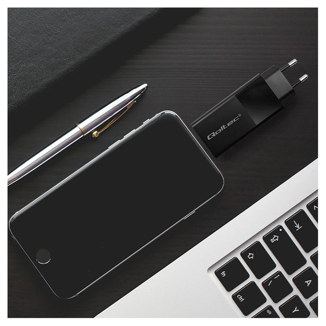 Qoltec 52382 GaN POWER PRO on võimas ja kompaktne must USB-C kiirlaadija 100W võimsusega, mis sobib neile, kes vajavad kiiret ja usaldusväärset laadimisvõimalust mitmele seadmele korraga. Tänu kaasaegsele galliumnitriidi (GaN) tehnoloogiale võimaldab laadija kiiret energiakannet väiksemas korpuses, ilma liigse soojusetekketa. Laadijal on USB-C ja USB-A port, millega saab samaaegselt laadida kahte seadet, näiteks sülearvutit, telefoni või tahvelarvutit.