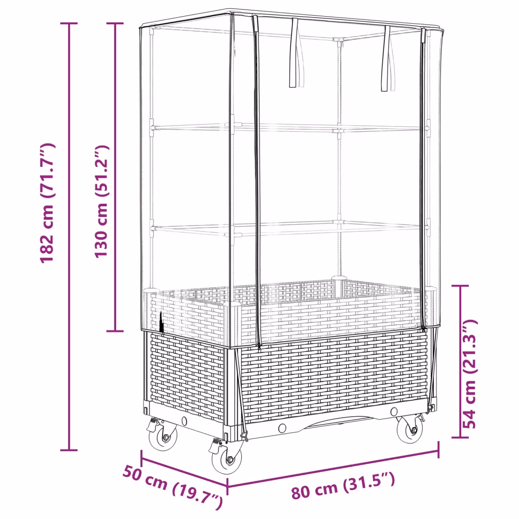 See ratastega kõrgendatud taimekast ühendab endas mugava istutuskoha ja kasvuhoonekatte, pakkudes taimedele kaitstud kasvukeskkonda ka piiratud väliruumis. Tugev konstruktsioon, reguleeritav ventilatsioon ja liigutatav alus võimaldavad kasvatada köögivilju, maitsetaimi ja lilli rõdul, terrassil või aias.