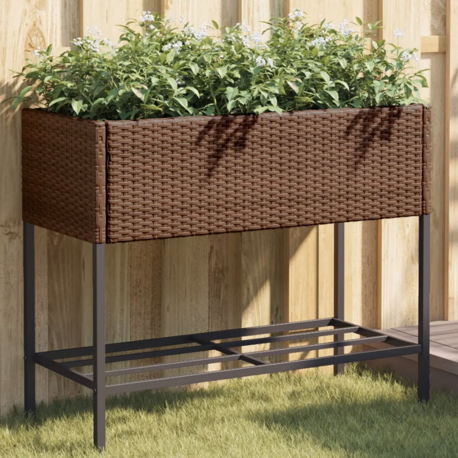 See riiuliga kõrgendatud aia taimekast on praktiline lahendus lillede ja maitsetaimede kasvatamiseks terrassil või aias. Pruunist polürotangist viimistlus sobitub hõlpsasti erineva välisinterjööriga, samal ajal kui pulbervärvitud terasraam tagab vastupidavuse ja stabiilsuse. Tänu alumisele riiulile on muld ja aiatarvikud alati käeulatuses ning kasvuala püsib puhtam ja korrastatum.