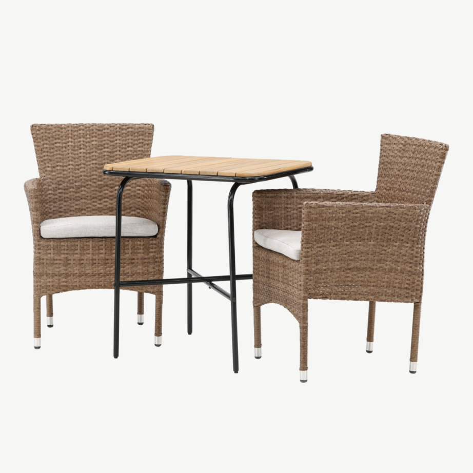 Komplekti naturaalsed toonid – beež kunstrotang, naturaalne puit ja must terasraam – sobituvad suurepäraselt põhjamaise esteetikaga. Minimalistlik, soe disain täiustab igat koduõue, rõdu või väikest kohviku terrassi.
