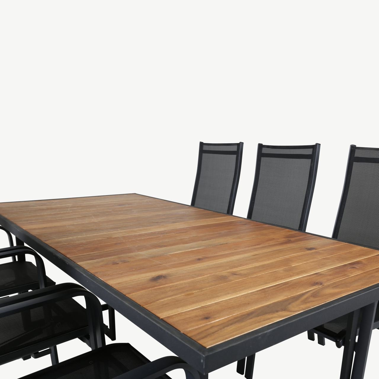 • Materjalid: akaatsiapuit ja teras (laud); alumiinium ja tekstileen (toolid)