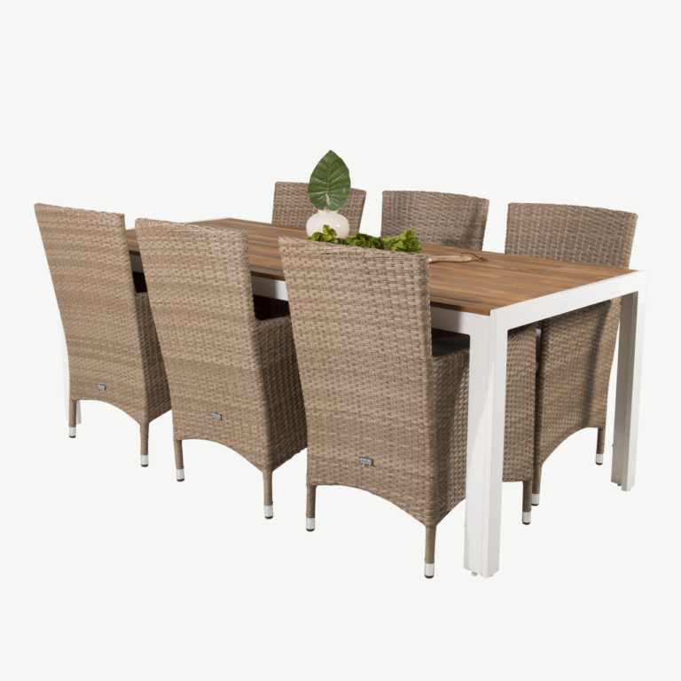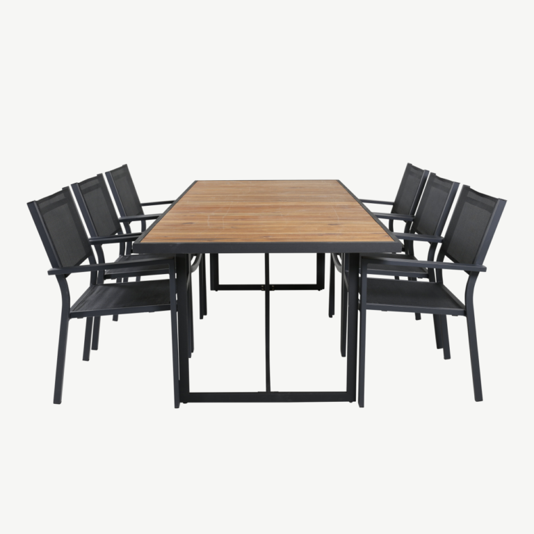 Too oma terrassile või aeda põhjamaist elegantsi Khung akatsiast aiamööbli komplektiga, mis ühendab kaasaegse disaini, vastupidavad materjalid ja praktilise mugavuse. Komplekti kuulub avar ristkülikukujuline söögilaud ja kuus musta, virnastatavat Copacabana söögitooli – täiuslik valik neile, kes hindavad stiili, kestvust ja soovivad luua hubase õhkkonna pere või sõprade jaoks.