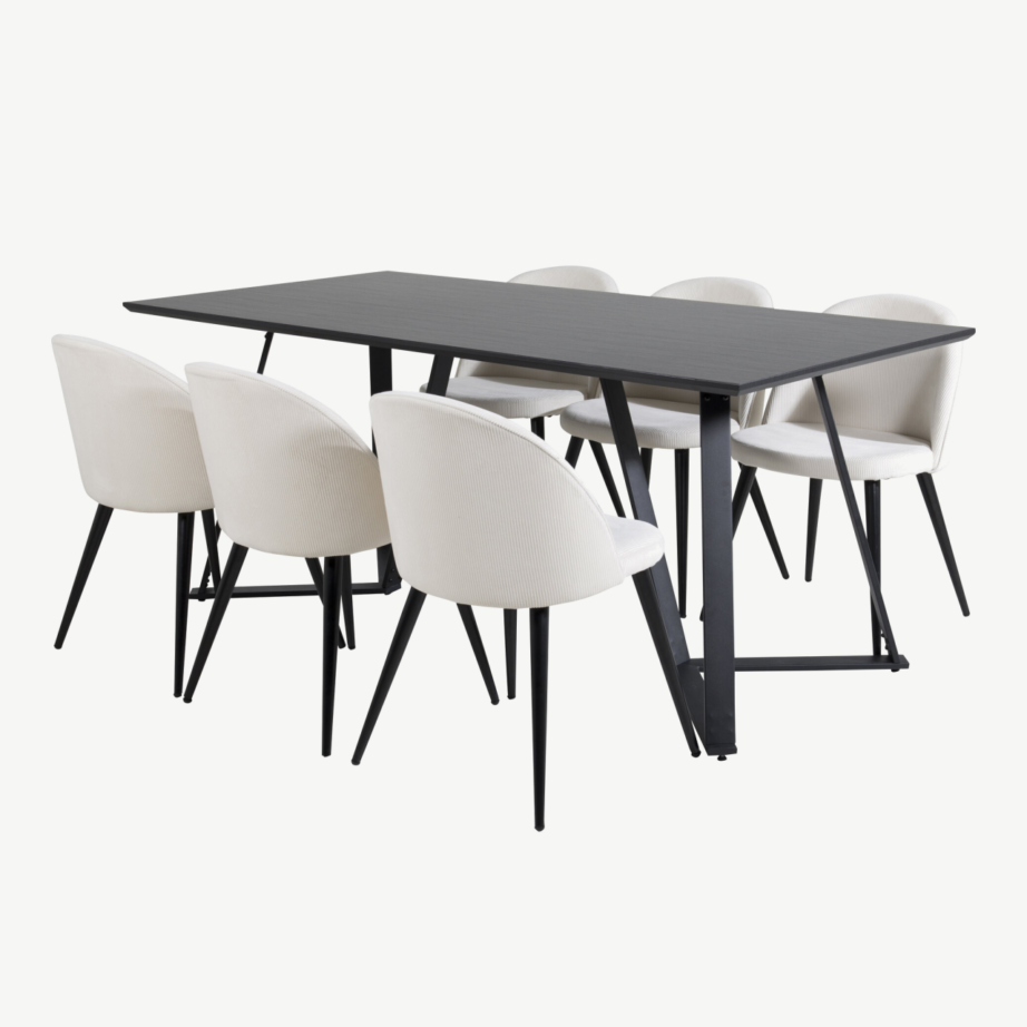 Marina söögitoa komplekt ühendab põhjamaiselt puhta joone, vastupidavad materjalid ja heledate beežide toolide hubasuse. Komplekt koosneb minimalistliku musta lauaplaadiga söögilauast ning kuuest pehmest, buklee-kangaga kaetud toolist. “Must söögilaud komplektiga” on ideaalne lahendus neile, kes hindavad stiili, funktsionaalsust ja ajatust.