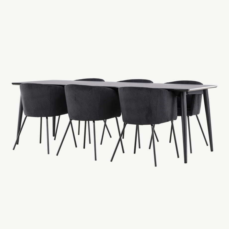 Too oma koju minimalistlikku luksust ning põhjamaist elegantsi musta söögilauakomplektiga. Ellis MDF söögilaud ja kuus Berit polüesterbukleekattega tooli moodustavad stiilipuhta terviku nii pere- kui sõpruskondade sööginaudinguteks. Ajatu välimus sobitub suurepäraselt modernsesse või klassikalise sisekujundusega interjööri ning pakub samal ajal avarust ja mugavust igapäevaselt.