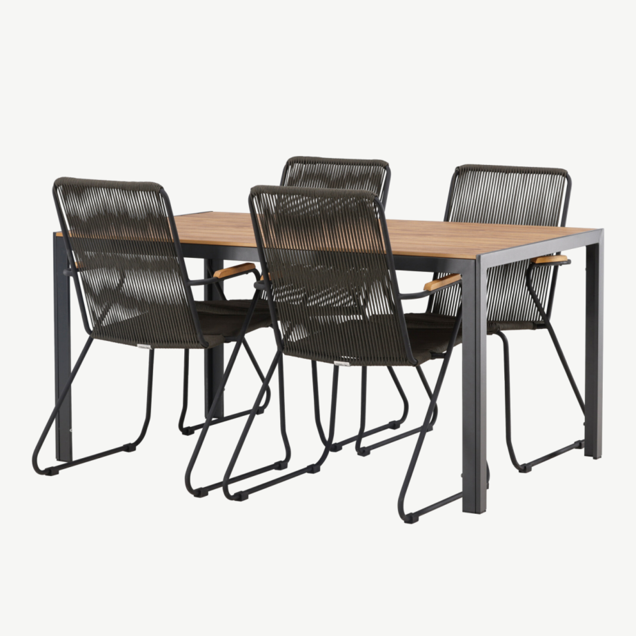 Komplekt ühendab endas põhjamaist minimalismi ja kasutajasõbralikku mugavust. Musta ja looduslähedase tooni kombinatsioon sobitub hästi igasse aeda või terrassile, olgu stiiliks modernne või klassikaline. Sirgete joontega laud ning elegantsed, käetugedega toolid loovad kutsuva ja esteetilise õhkkonna.