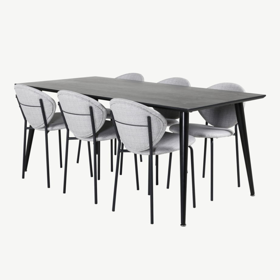 Must söögikomplekt kuue tooliga rõhutab põhjamaist stiili ning sulandub kergesti nii modernsesse kui klassikalisse interjööri. Tänu vastupidavatele materjalidele sobib suurepäraselt nii igapäevasteks toimetusteks kui ka perega või sõpradega ühisteks õhtusöökideks.