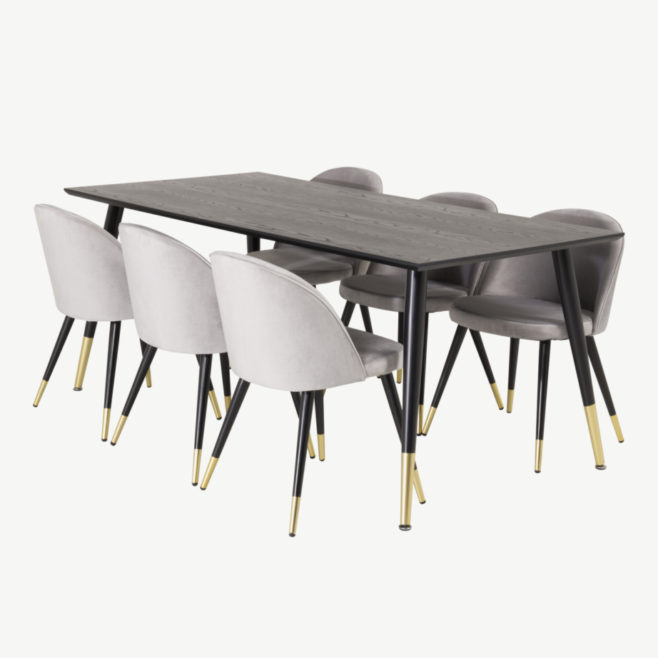 Dipp musta viimistlusega söögilauakomplekt ühendab ajatu põhjamaise disaini luksuslike detailidega, tuues Teie koju stiili ja praktilisust. Komplekt koosneb eraldi müüdavast ristkülikukujulisest söögilauast ning sametiste toolidega, moodustades harmoonilise terviku, mis pakub mugavust nii perele kui külalistele.
