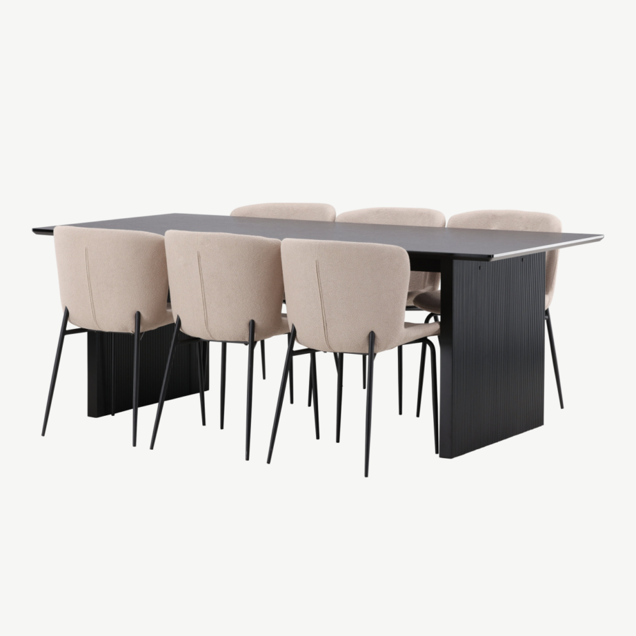 Vail kõigi trendidega kooskõlas olev must söögilauakomplekt ühendab minimalistliku põhjamaise disaini, kvaliteetsed materjalid ja maksimaalse kasutusmugavuse. See komplekt sobib suurepäraselt avarasse söögituppa, pakkudes elegantset visuaali ning hubast õhkkonda igaks pere- ja sõpruskonnaga koosviibimiseks.