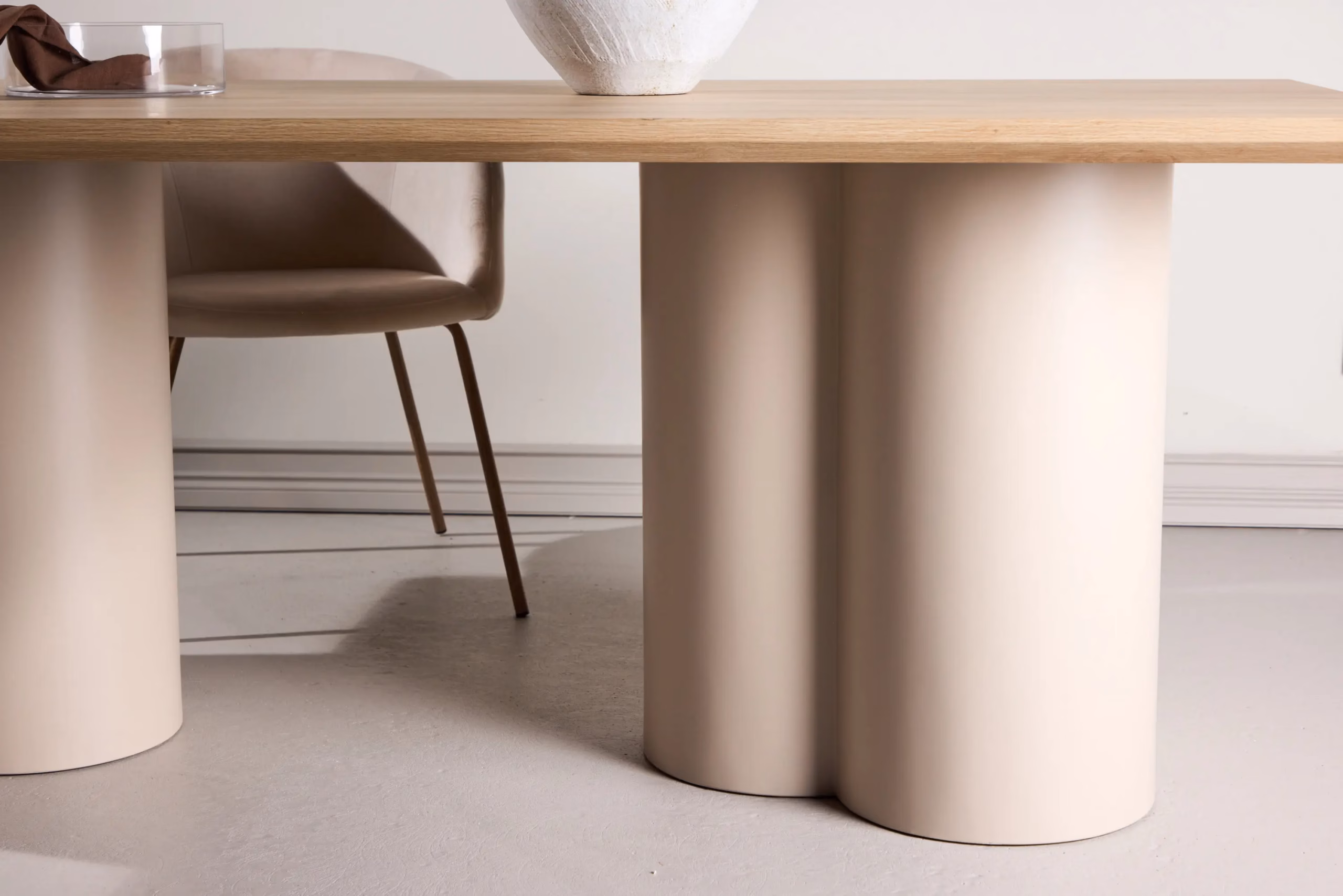 - Stabiilsed beežid jalad MDF-ist – kaks jõulist silindriliste jalgade plokki annavad lauale kindla toe ja kaasaegse skulpturaalse ilme.