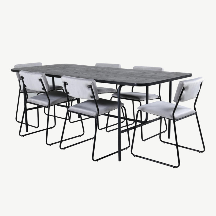 Uno ristkülikukujuline söögilauakomplekt koos kuue Kenth tooliga on ideaalne lahendus, kui soovid ühendada elegantset põhjamaist joont ning praktilisust. Komplekt sobib suurepäraselt nii avarasse elutuppa kui ka stiilsesse kööki, tuues ruumi õhulisust ning nutikat ruumikasutust. Must söögilauakomplekt velvettoolidega rõhutab kodu moodsat ilmet ja ajatut maitsekust.