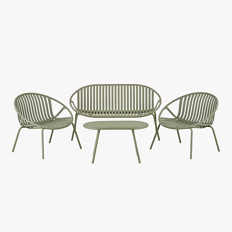 Saly lounge komplekt on neljast osast koosnev istumisnurk, kuhu kuuluvad 2 tooli, 2-kohaline pink ja kohvilaud. Komplekt on mõeldud lõõgastumiseks ja ajaveetmiseks aias või terrassil, pakkudes korraga mitmele inimesele mugavat istumisruumi. Roheline toon lisab välialale värskust ja sobitub hästi ümbritseva loodusega. Materjalidena on kasutatud polüpropüleeni ja terast, mis loovad ühtse, kaasaegse ilmega komplekti. See on praktiline valik, kui soovid eraldi lounge-ala oma kodu väliruumis.