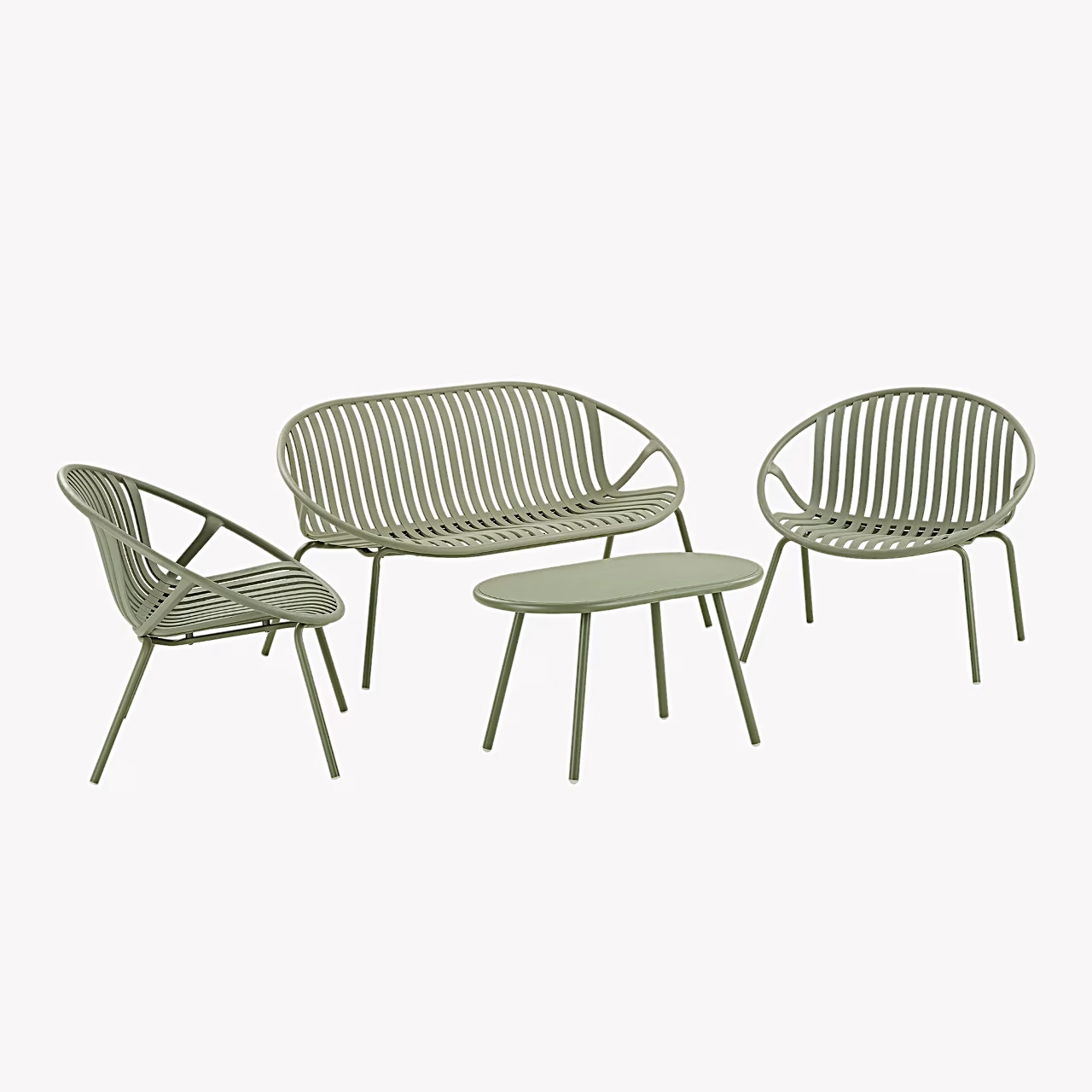 Komplekti juures on kasutatud polüpropüleeni (PP) ja terast. Materjalide kombinatsioon annab komplektile selge joonega ja kaasaegse ilme, mis sobib hästi paljude erinevate aiamööbli stiilidega. Roheline värv lisab istumisnurgale rahuliku ja looduslähedase tonaalsuse, mida on lihtne kombineerida nii neutraalsete kui ka erksamate tekstiilide ja aksessuaaridega. Materjalivalik sobib igapäevaseks kasutamiseks koduses aias või terrassil ilma liigsete detailideta.