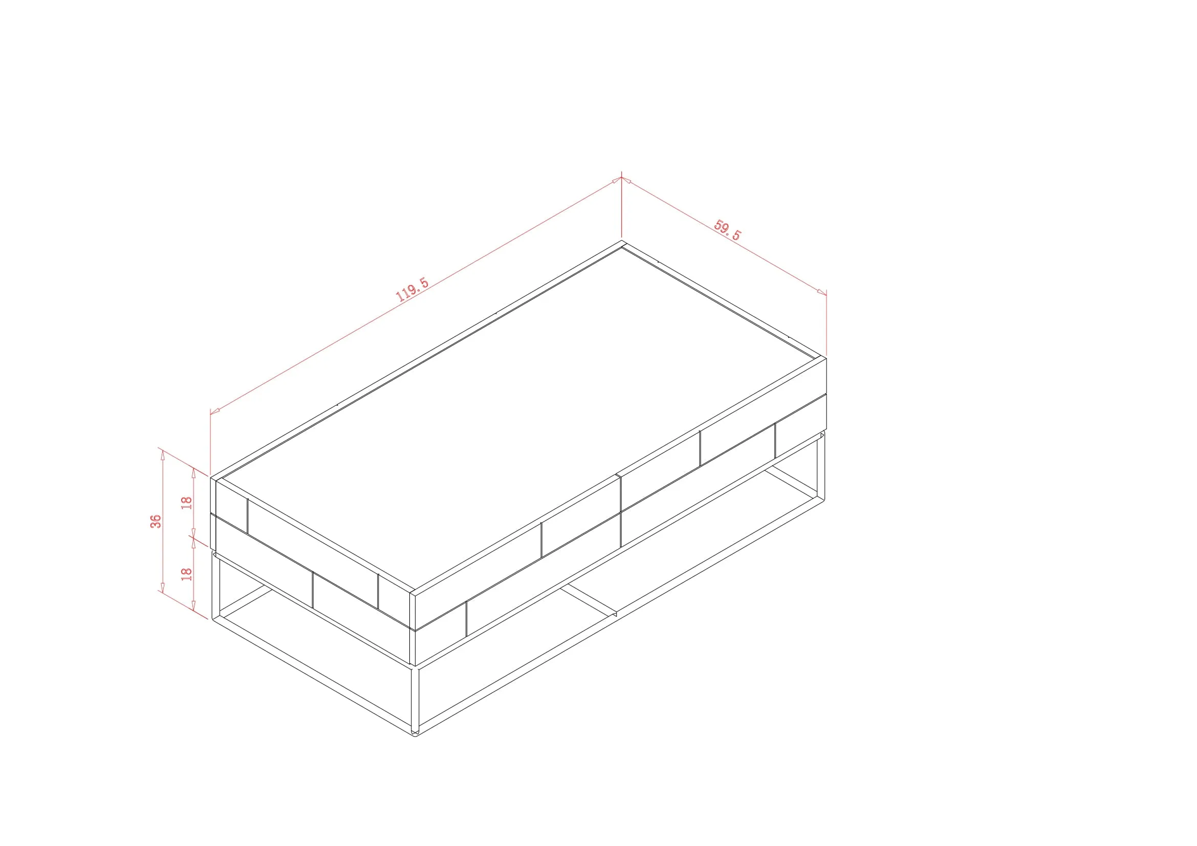 Mõõtmed: Laius 119,5 cm, sügavus 59,5 cm, kõrgus 36 cm.