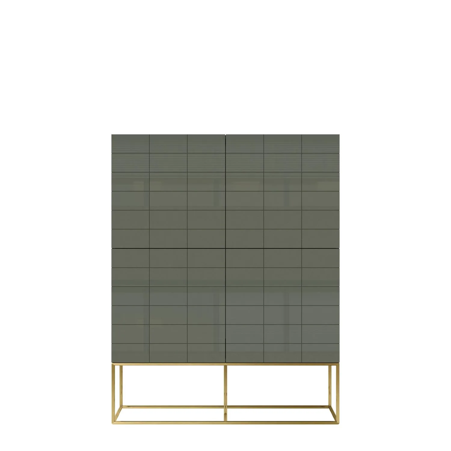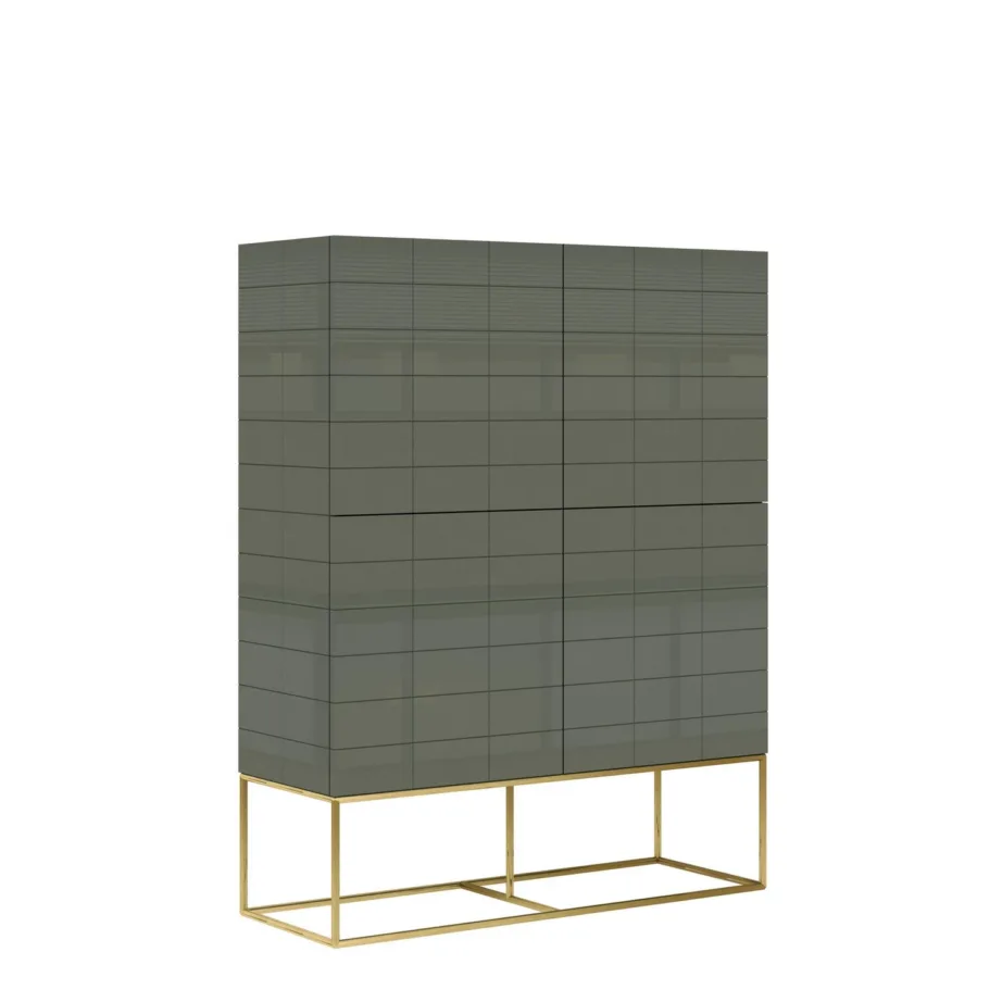 Rose Hill RH04 kõrge kapp elutuppa. See modernne klassikaline kapp toob teie elutuppa kaasaegse elegantsi ja funktsionaalsuse. Tsemendiroheline kõrgläikega MDF-korpus koos kontrastsete kuldsete roostevabast terasest jalgadega loob luksusliku ja harmoonilise välimuse. Kapi iseloomulikud 3D-esipaneelid ja minimalistlik vorm lisavad ruumile visuaalset sügavust ja stiili.