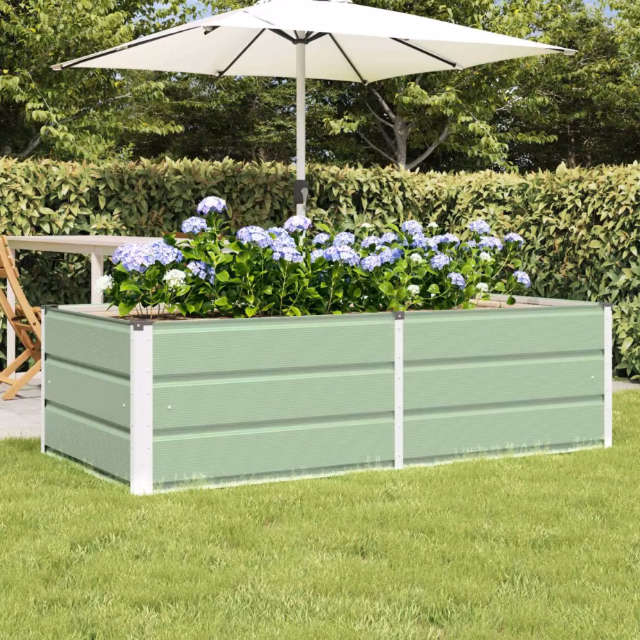 See roheline terasest taimekast loob aias või terrassil selge ja korrastatud istutusala. Tugevast terasest ja plastist valmistatud kast pakub stabiilset kasvukeskkonda nii lilledele kui maitsetaimedele. Avardatud kõrgus vähendab kummardamist ja aitab hoida taimedel ühtlast mullasügavust, sobides hästi nii algajale kui kogenud aednikule.