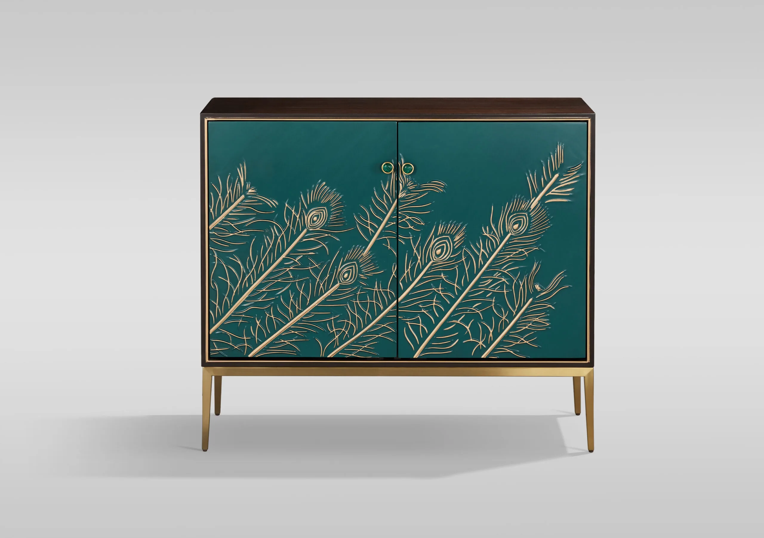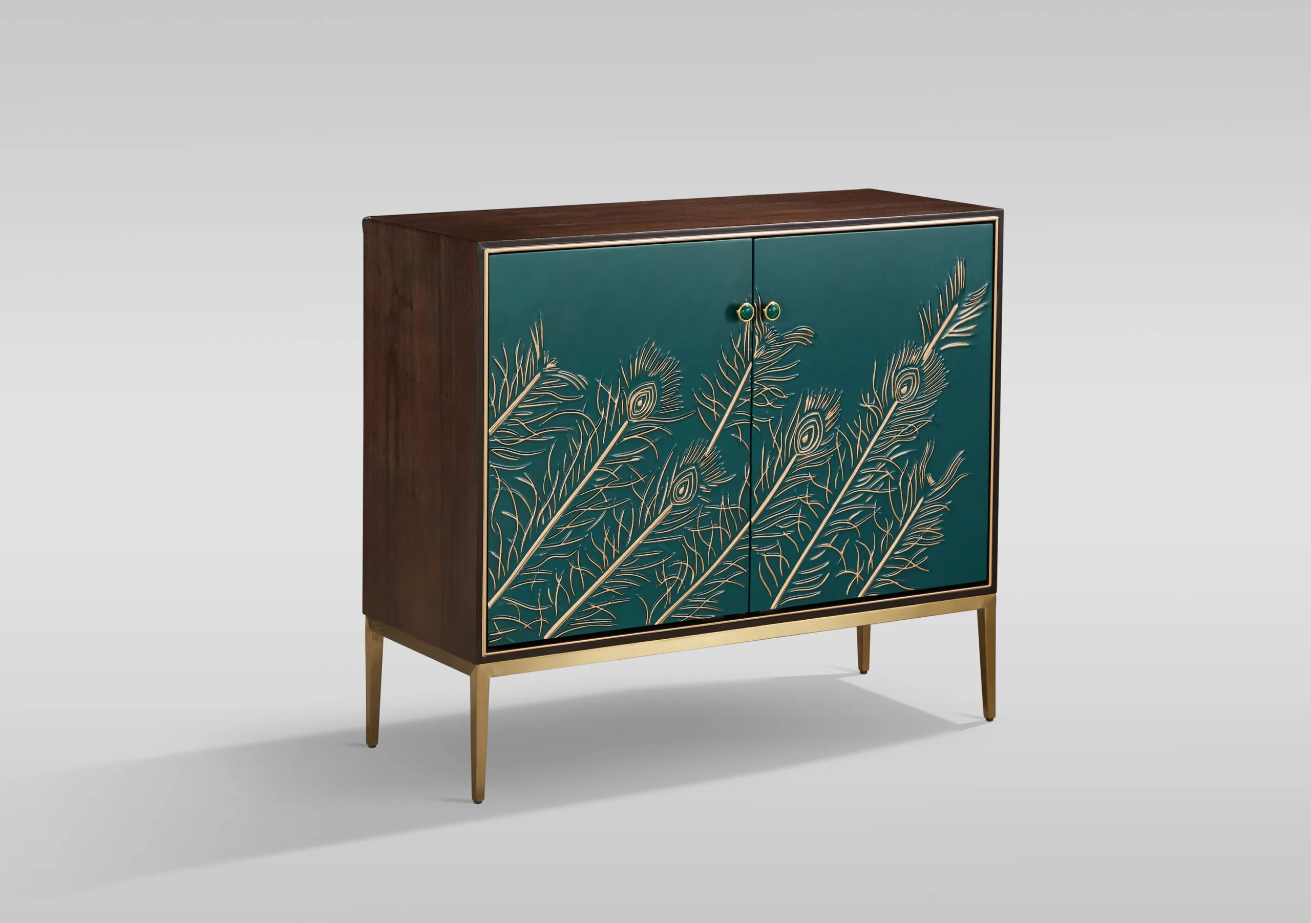 Stilig ST804 kummut elutuppa. See elegantne kummut ühendab endas stiili ja funktsionaalsuse, sobides suurepäraselt igasse kaasaegsesse elutuppa. Kummuti pähklipuu toon koos türkiissiniste esipaneelide ja kuldsete jalgadega loob luksusliku ja pilkupüüdva ilme. Esipaneelide reljeefne muster, mis meenutab paabulinnu sulgi, lisab ainulaadset dekoratiivsust, samas kui uste ümber kulgev dekoratiivne triip täiendab disaini.