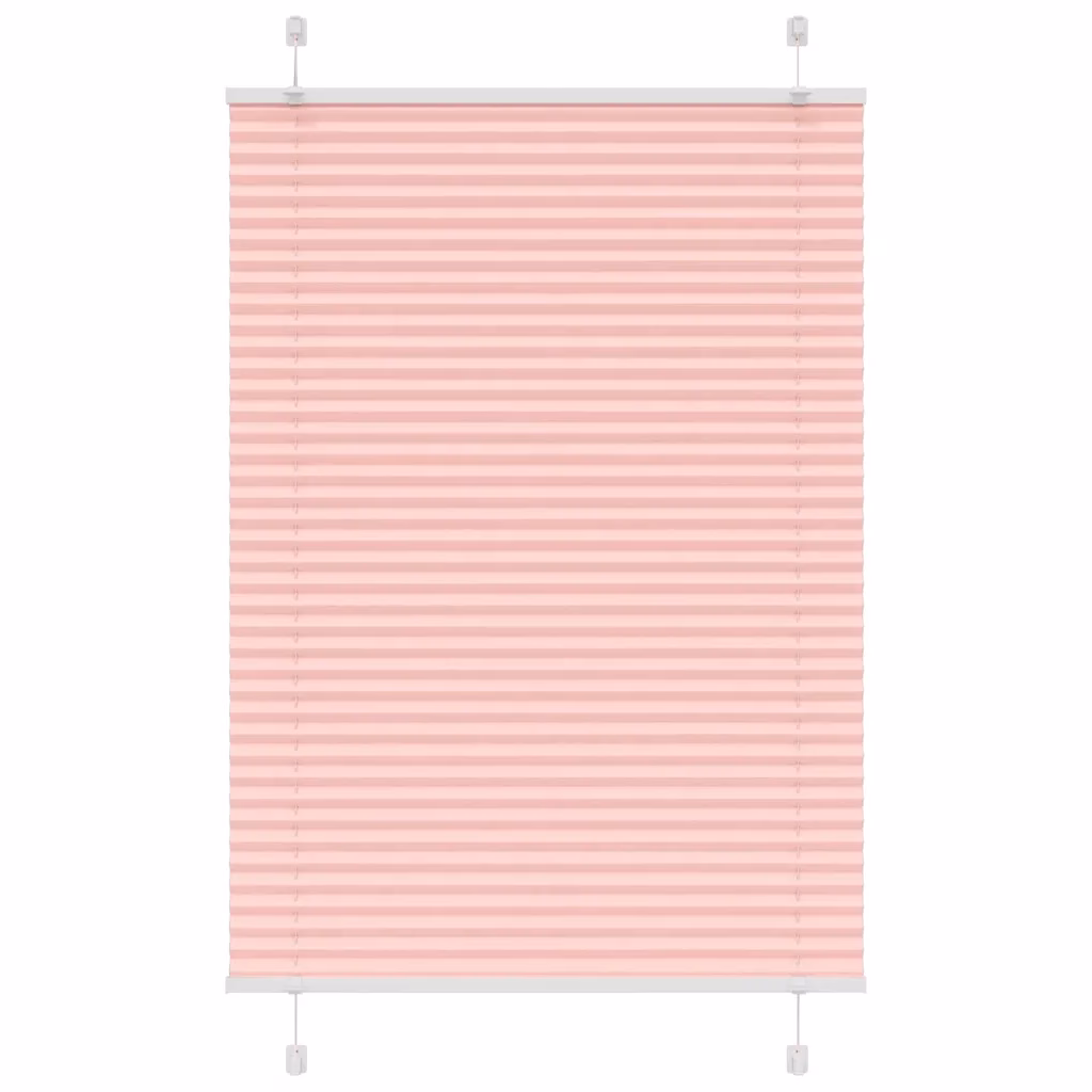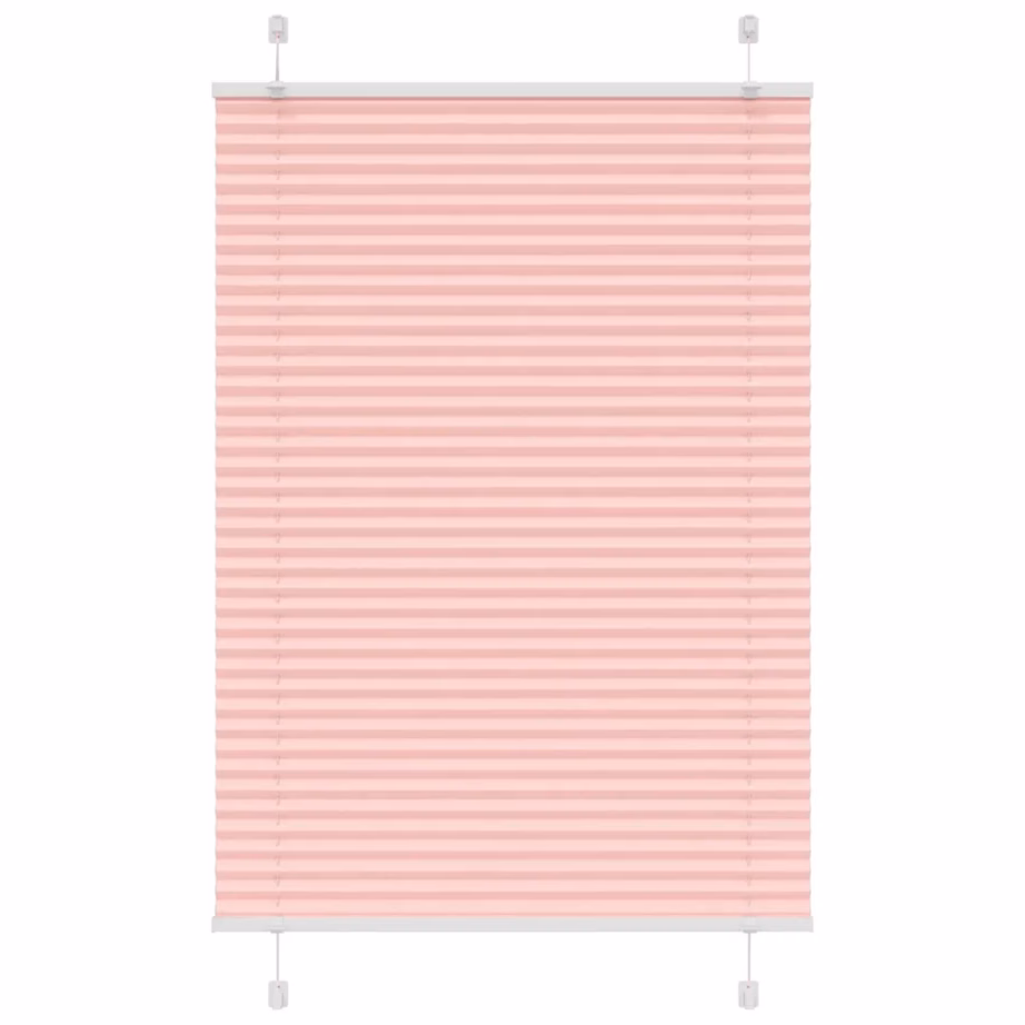 See roosa plisseeritud ruloo suurusega 95 x 150 cm lisab ruumile hubasust, pakkudes samal ajal privaatsust ja kaitset pimestava päikese eest. Volditud polüesterkangas ei ole läbipaistev, kuid ei pimesta ruumi täielikult, nii et tuppa jääb meeldiv pehme valgus.