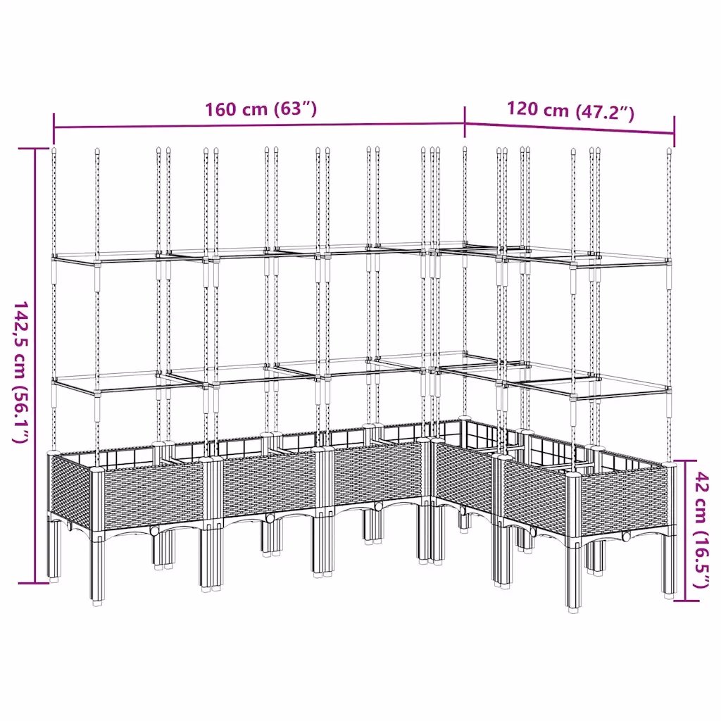 - Suur istutusmaht – 160 x 120 cm pind pakub rohkelt ruumi köögiviljade, lillede ja muude taimede kasvatamiseks ühes kompaktses taimekastis.