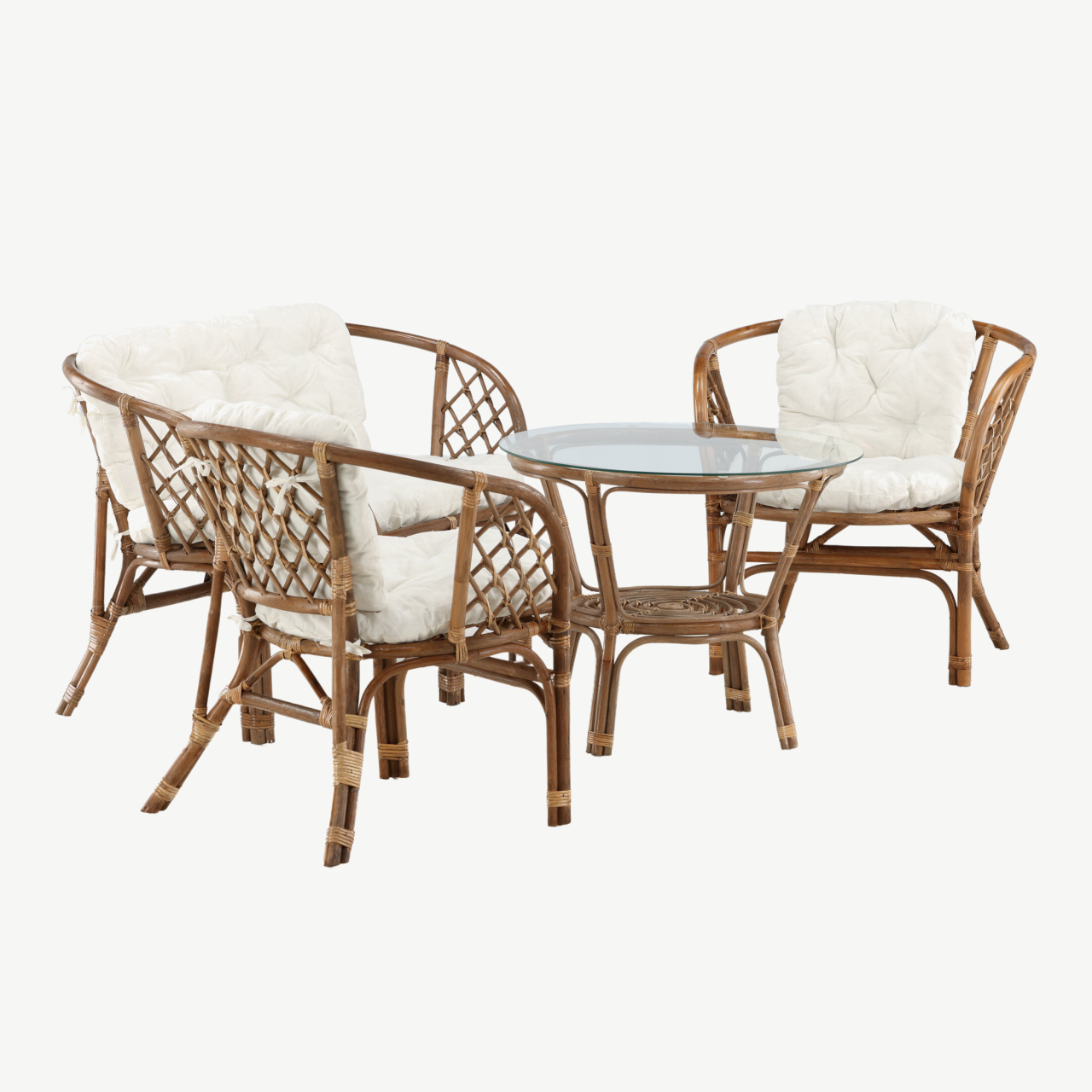 - Materjalid: raamid ja detailid 100% naturaalsest rotangist; istme- ja seljatoe padjakatted kvaliteetsest polüestrist; lauaplaat tugevast klaasist.