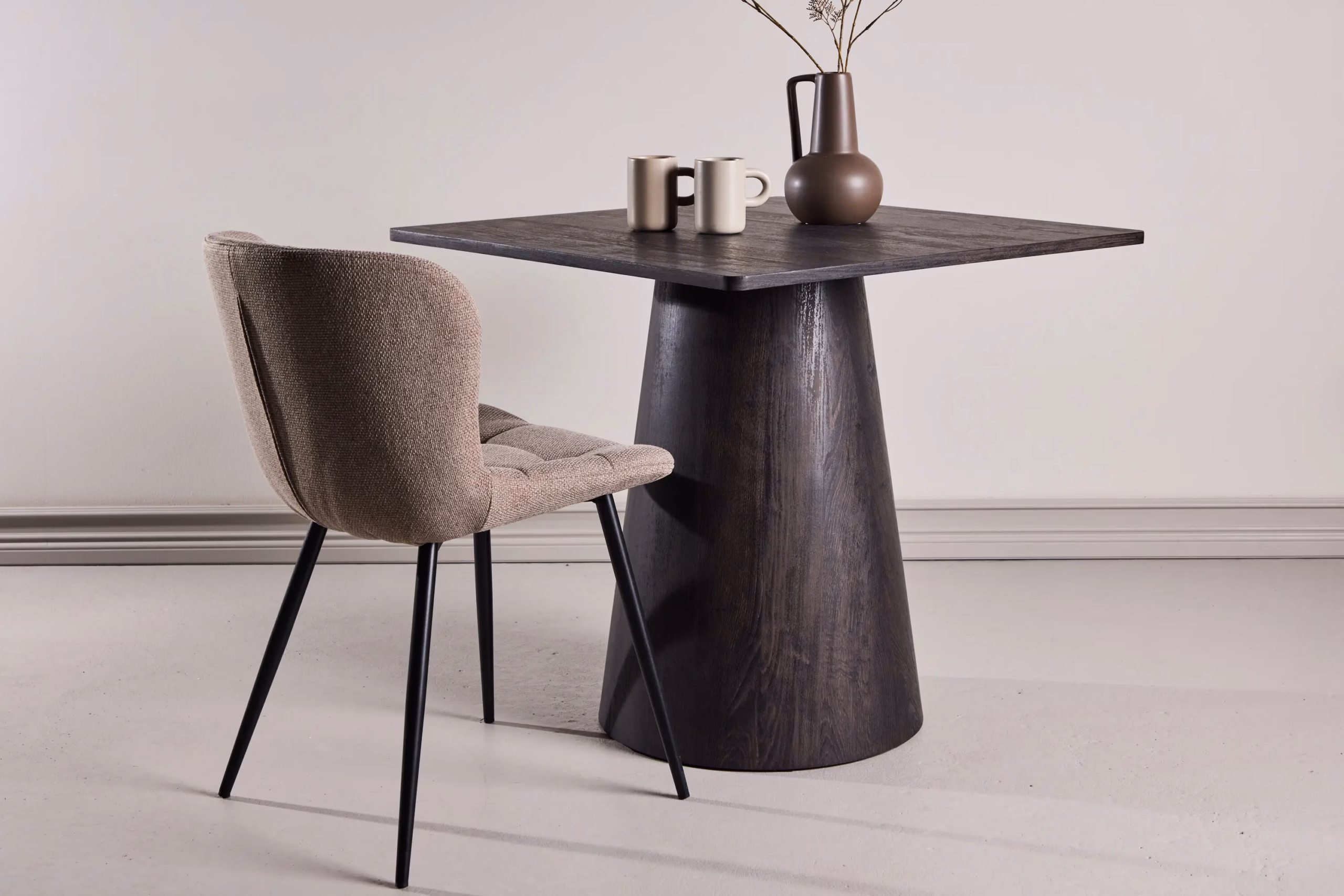 Lanzi on kompaktne ruudukujuline söögilaud mõõtudega 80 × 80 × 75 cm, mis sobib suurepäraselt väiksemasse kööki, sööginurka või avatud elutuppa. Keskelt paiknev koonusekujuline jalg jätab lauaplaadi ümber vabalt liikumisruumi, nii et istuda on mugav igal küljel. Soe mokkatoon annab põhjamaisele interjöörile hubase ning samas modernse ilme, mis sobitub nii heledate kui ka tumedate köögimööbliga. Tänu vastupidavale MDF-konstruktsioonile ja praktilisele paberlaminaadiga viimistlusele on see söögilaud ühtviisi hea valik igapäevaseks perega einestamiseks ja sõpradega õhtusöökide nautimiseks.