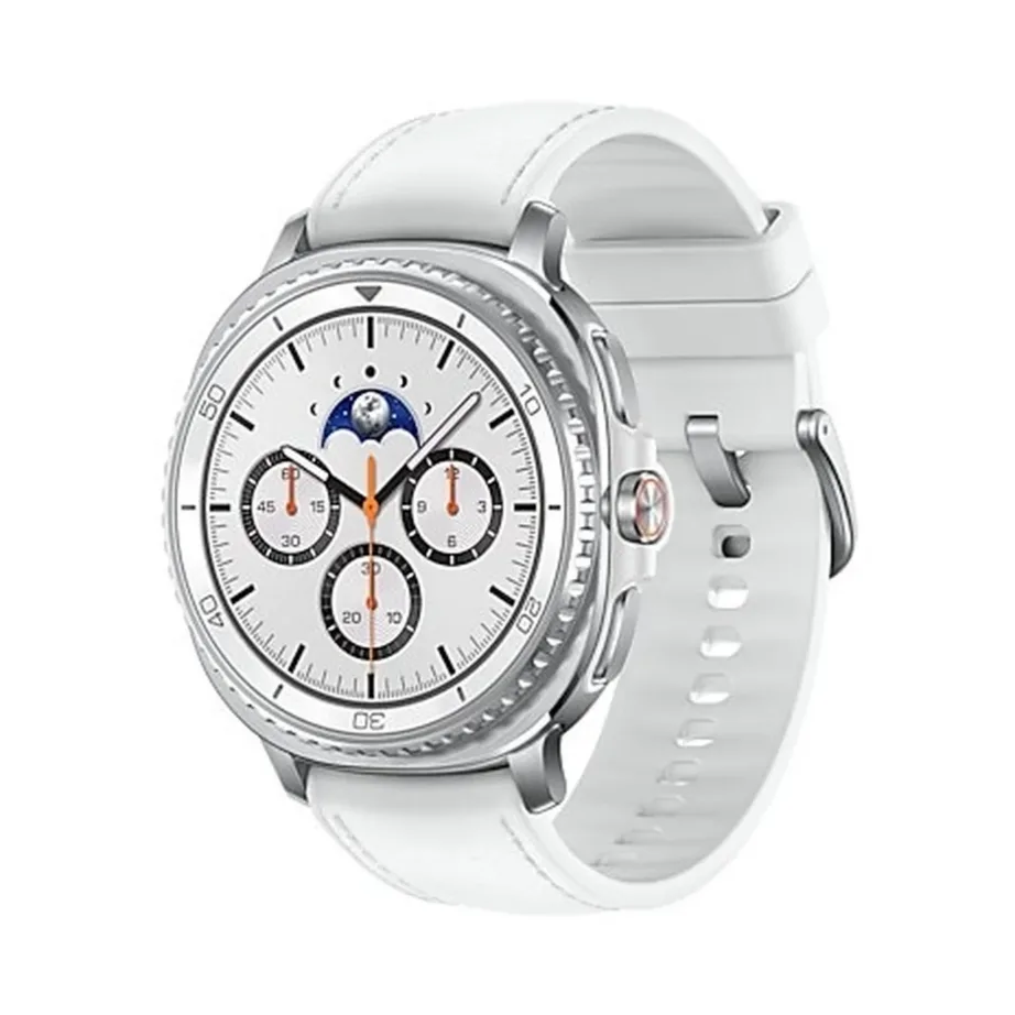 Samsung Galaxy Watch8 Classic SM-L500NZWAEUE 46 mm hõbedane alumiiniumist AMOLED nutikell, Super AMOLED 1,3″ ekraan, pulsi- ja aktiivsusmonitor, 5 ATM/IP68 veekindlus, 64 GB, GPS, Wi-Fi, valge rihmaga