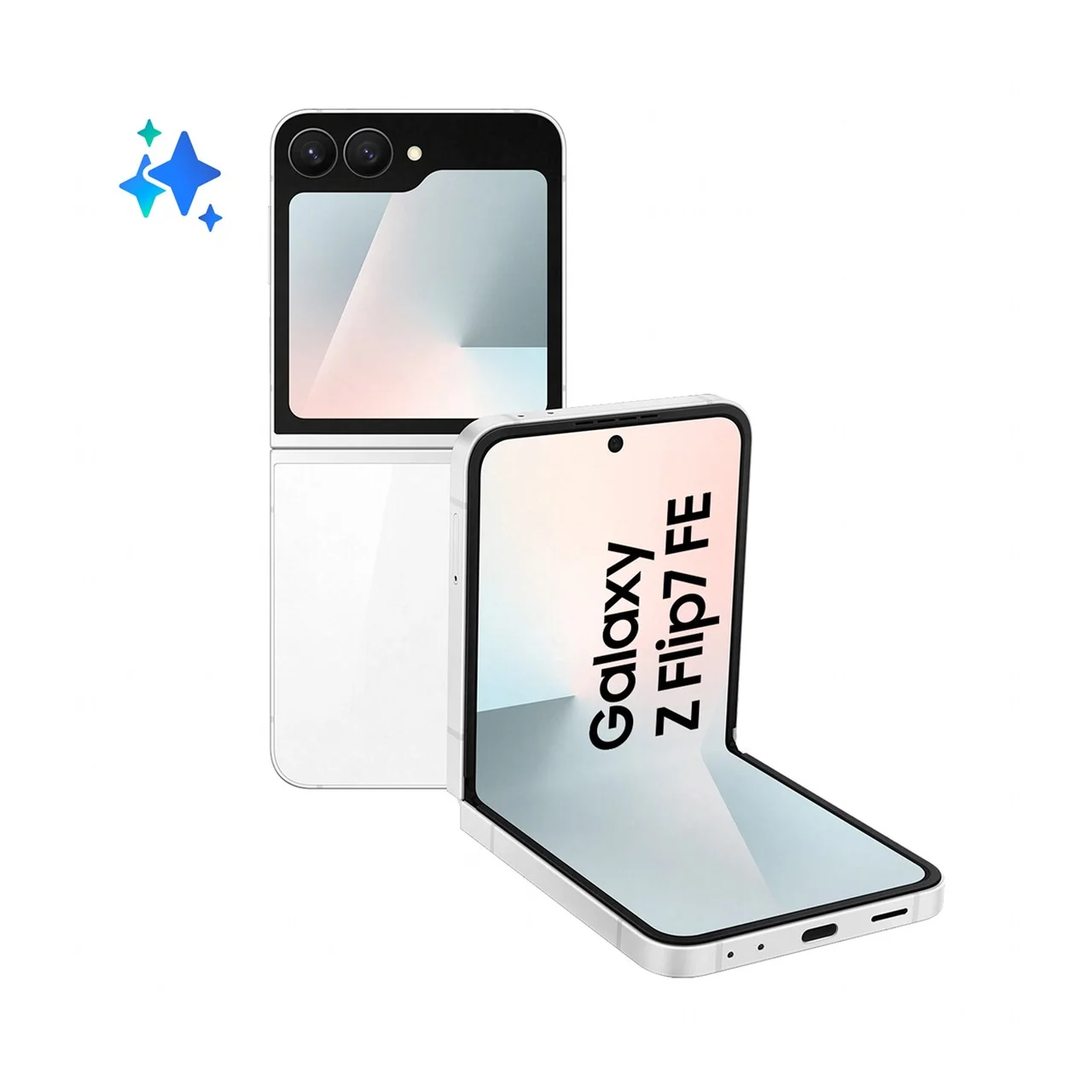 Samsung Galaxy Z Flip7 FE on kompaktne 6,7-tollise Dynamic AMOLED ekraaniga valge volditav nutitelefon, millel on 8 GB muutmälu, 256 GB sisemälu ja 4000 mAh aku.