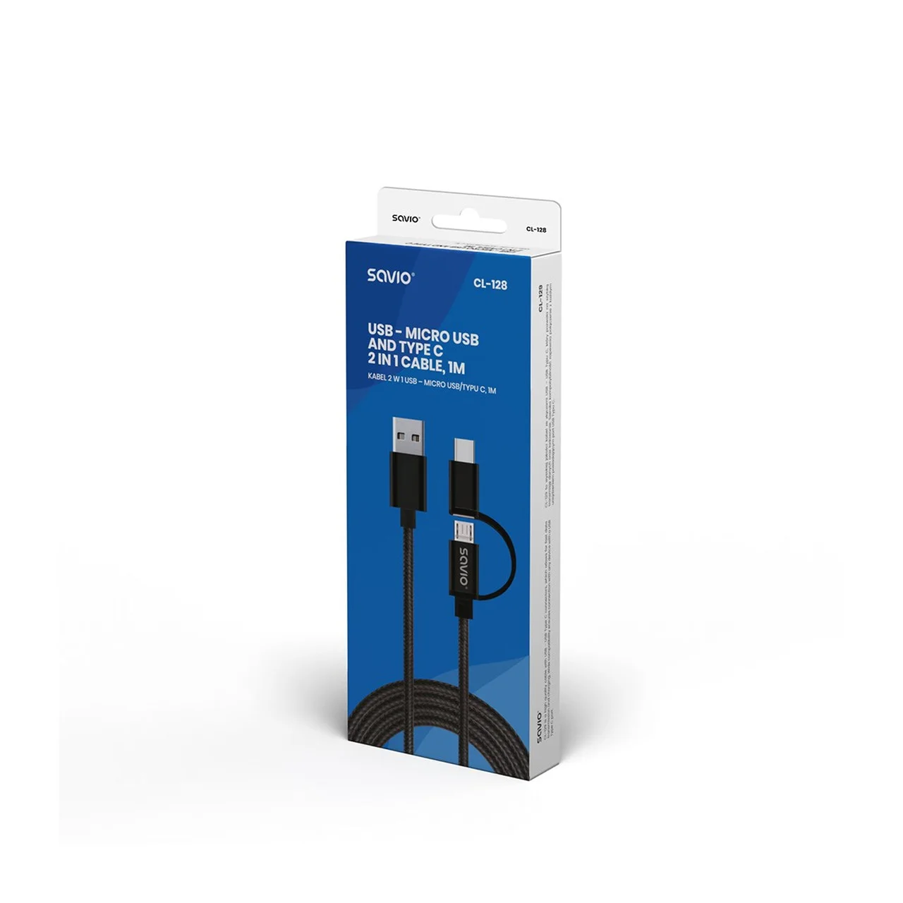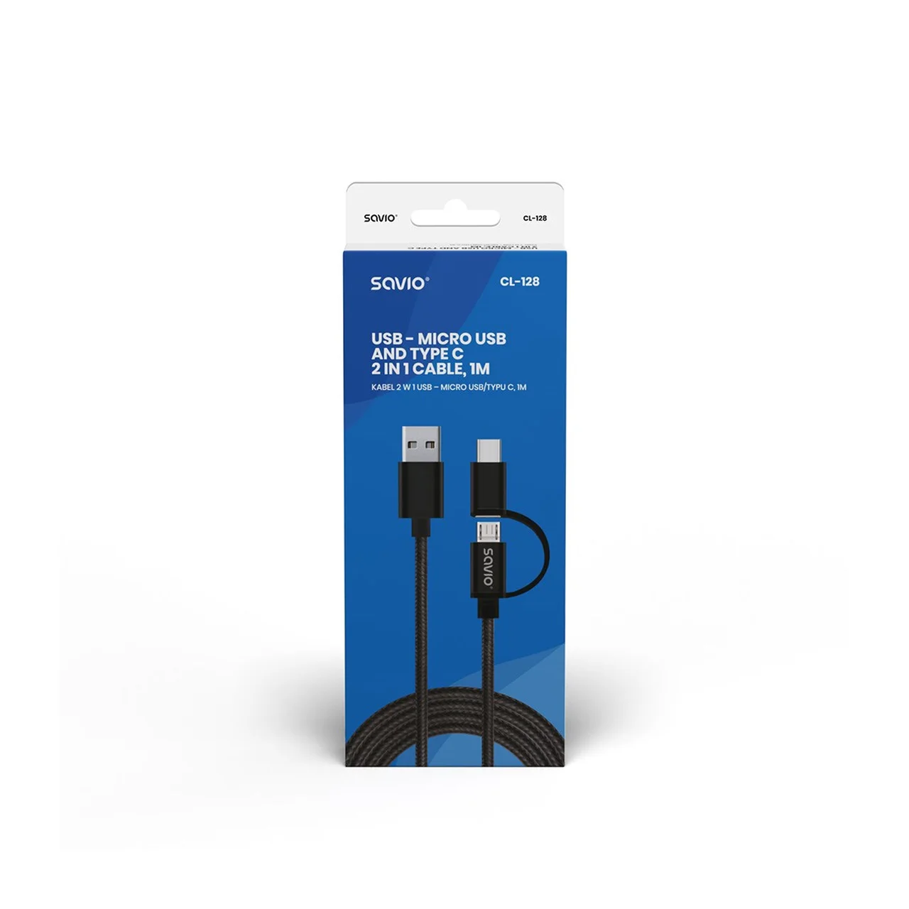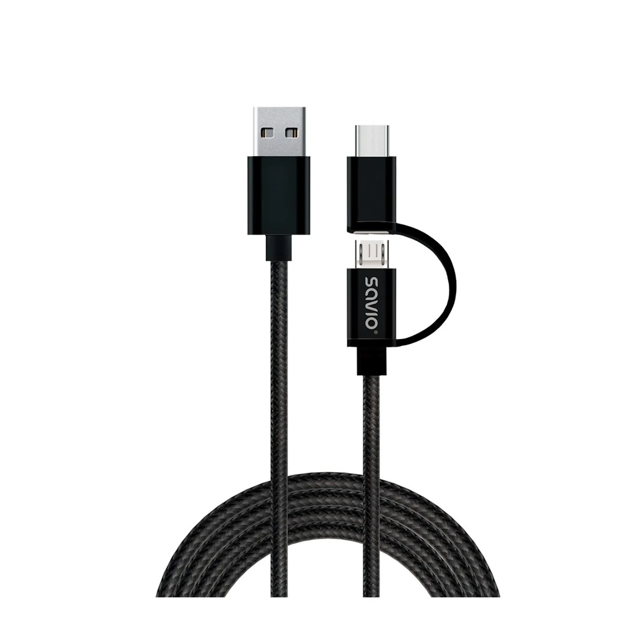 Savio CL-128 1 m must USB 2.0 USB-A – USB-C/Micro-USB laadimis- ja andmesidekaabel, 2.1 A