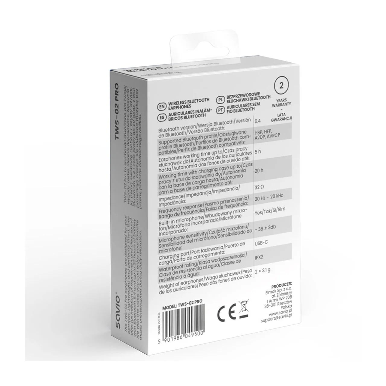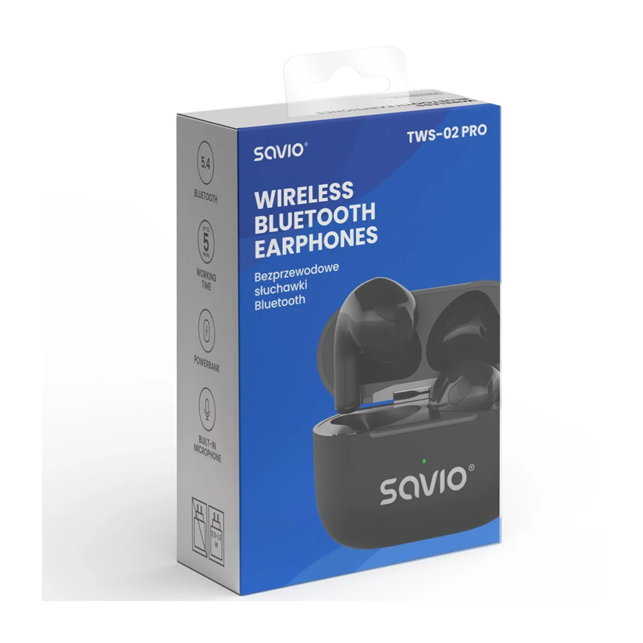 SAVIO TWS-02 PRO on mustad juhtmevabad in-ear kõrvaklapid, millel on Bluetooth 5.4, USB-C laadimiskarp ja IPX2 veekindlus, sobides ideaalselt igapäevaseks muusika kuulamiseks.