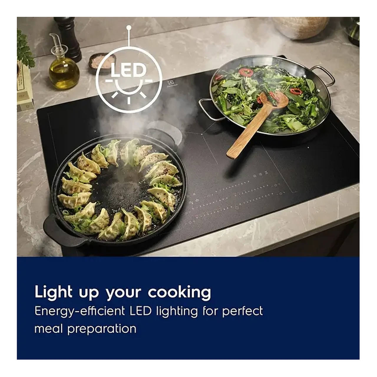 - LED-valgustus annab ühtlase valguse kogu keedupinnale, aidates paremini jälgida toidu küpsemist ja hoida tööpinna ülevaatlikuna.