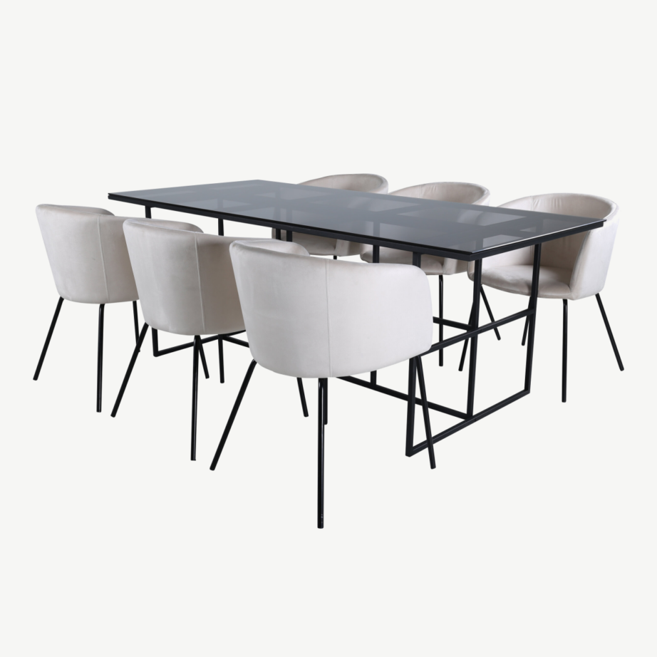 Leif must klaasist söögilauakomplekt ühendab tööstusliku stiili, vastupidavad materjalid ja mugavad velvetist toolid ühtseks tervikuks. Disain, mis loob eksklusiivse ilme ning pakub tõelist mugavust aastateks.
